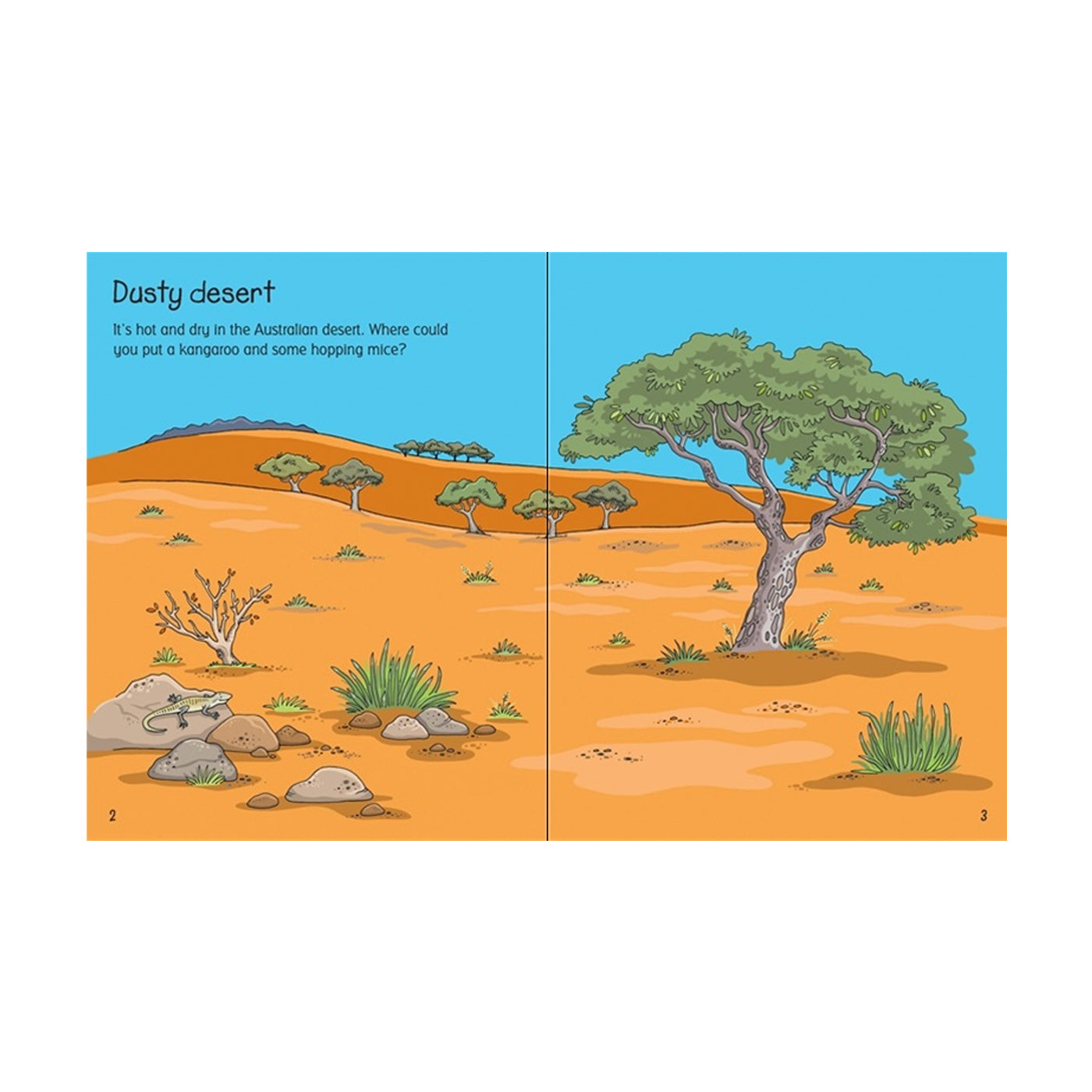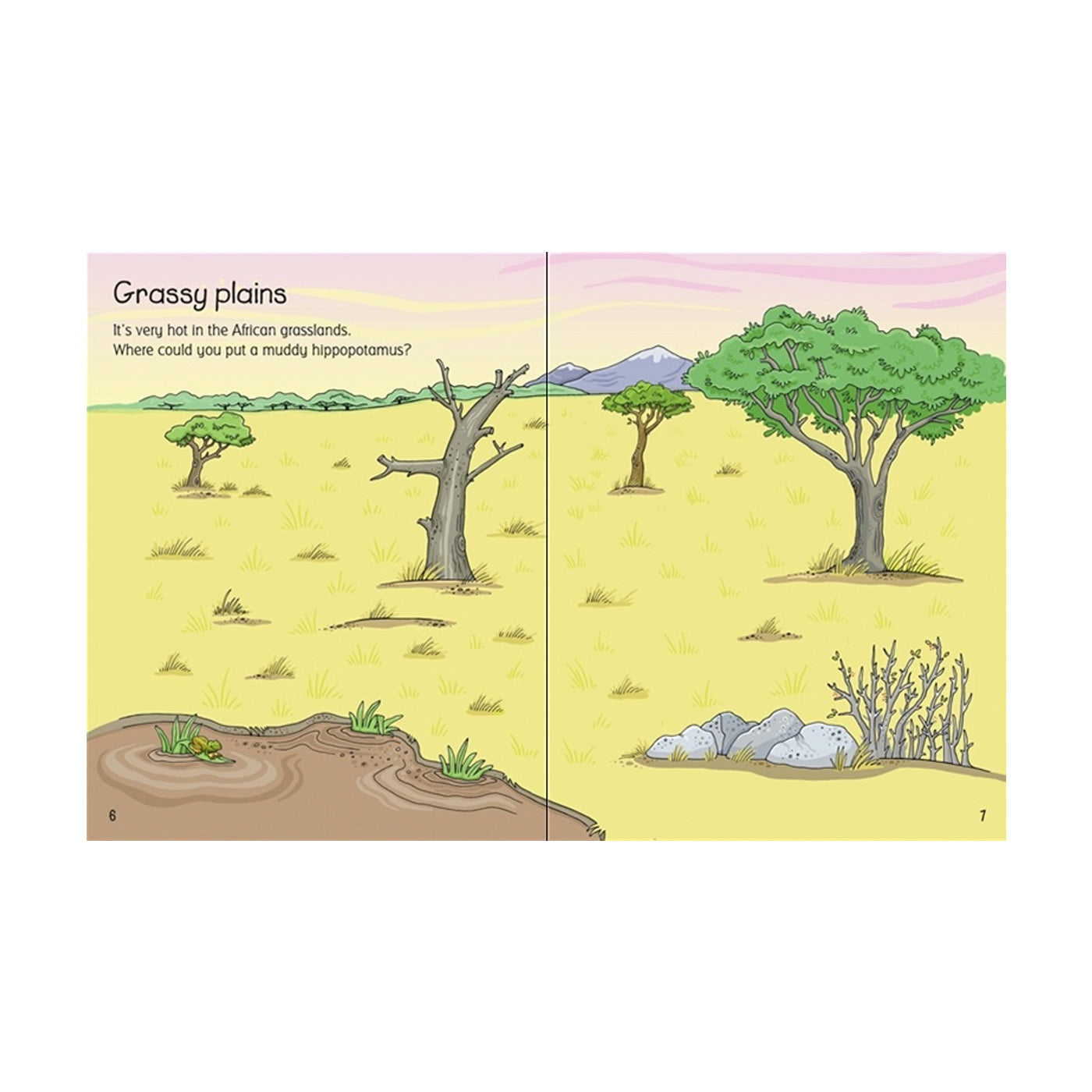 Hayvanlar aleminine doğru küçük bir yolculuğa çıkaran bu etkinlik kitabında, 250'den fazla çıkartma çocukları bekliyor. Kitabın sayfalarında arka planda kurak bir çöl, yağmur ormanları ya da Afrika'nın düzlükleri resmediliyor. Çocuklarsa, hayvanların doğal yaşam alanlarını betimleyen bu fonlar üzerine diledikleri çıkartmayı yapıştırabiliyor. Kitapta ayrıca aslan, kaplan, zebra, zürafa, yılan, timsah gibi vahşi hayvanların yanı sıra daha tanıdık çiftlik hayvanlarının resimleri de küçük eller tarafından boyanmak için bekliyor.