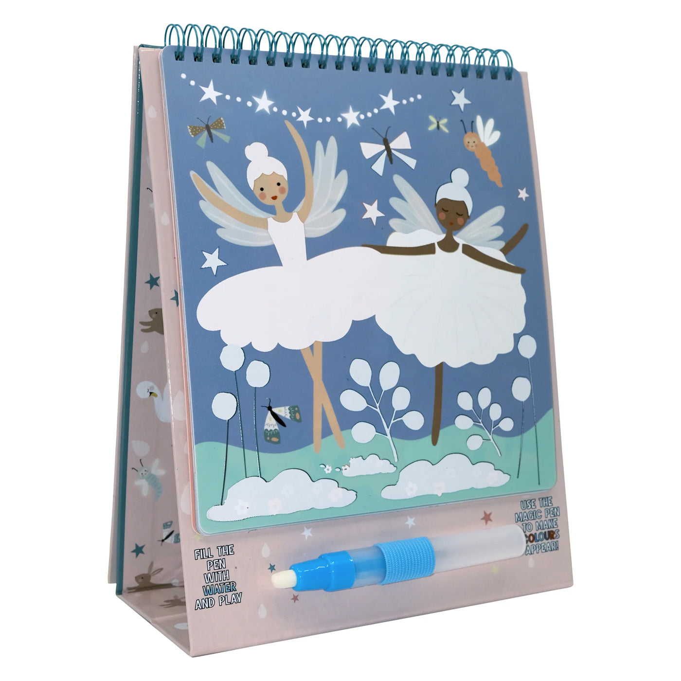 Suyla renklenen sihirli sayfaları çocuklar çok sevecek! 6 farklı renk sayfa, bu eğlenceli sayfaları çevirmeye yarayan spiral aparat ve 1 suyla doldurulan kalemi mevcuttur. Balerinler, tavşanlar, kuğular, göller, kuşları ve daha fazlasını su kalemi yardımıyla renklendirebilirsiniz. Çocuklar boyadıkça renklenen masal dünyasına bayılacak!