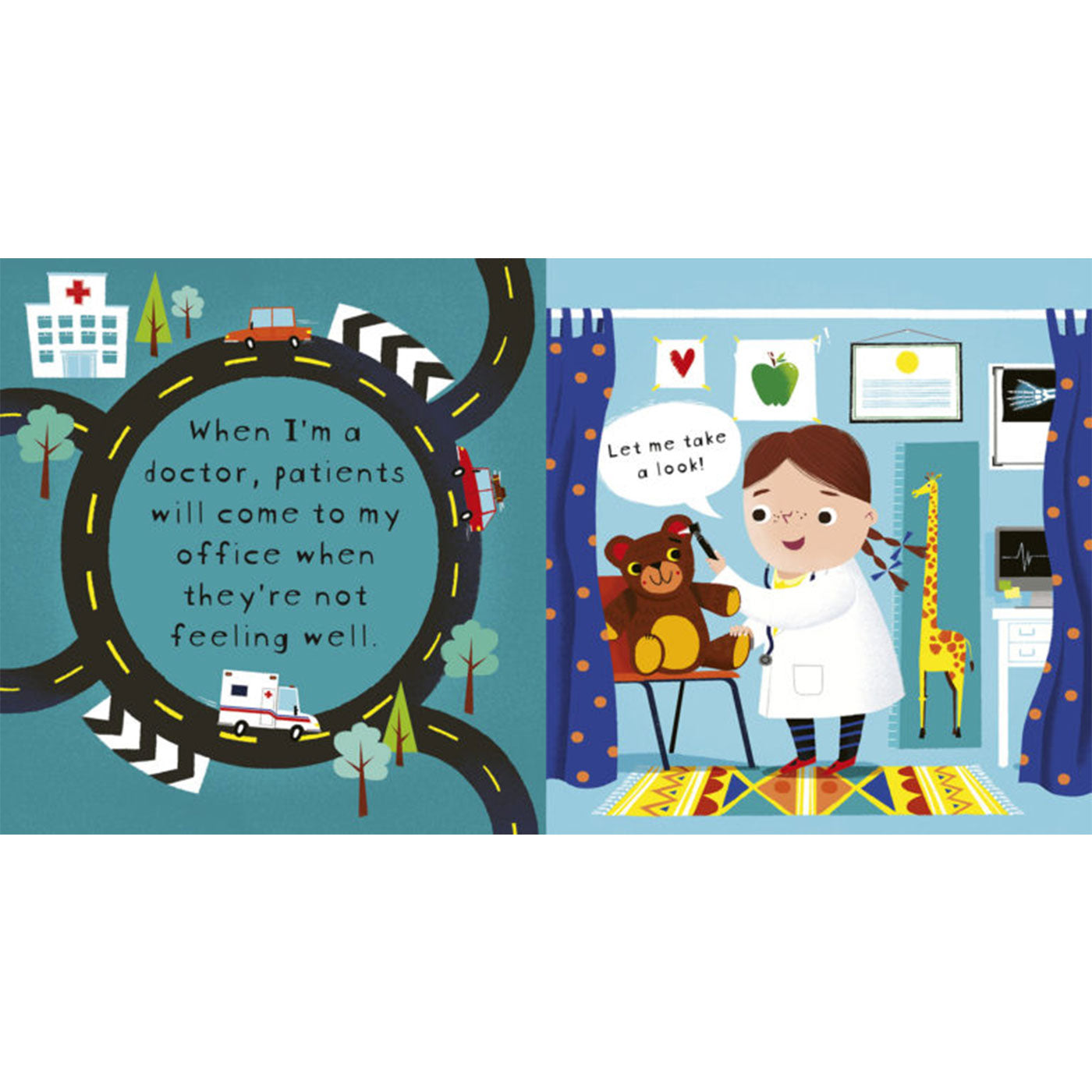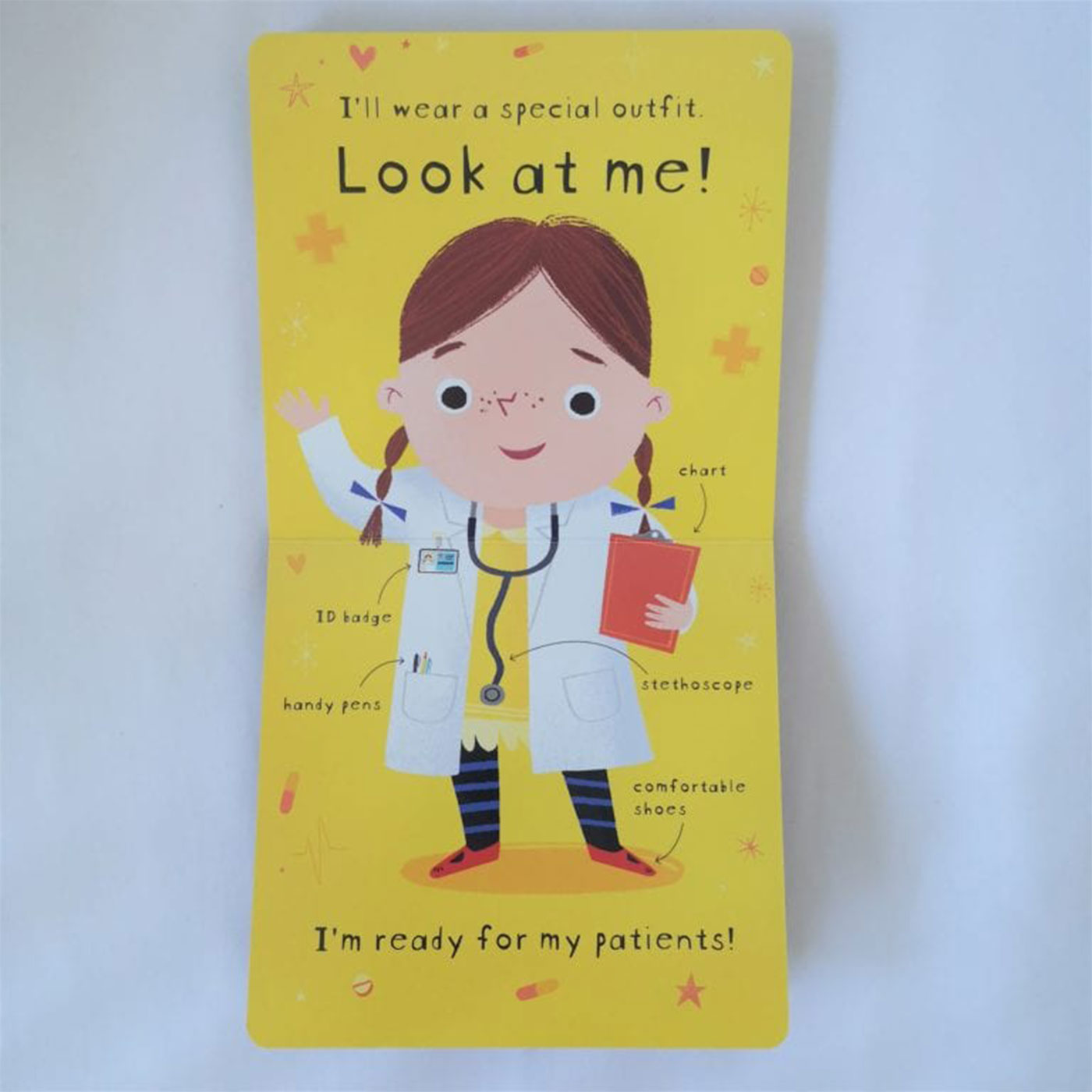 Bu kitap, çocukların doktor olmanın nasıl bir şey olduğunu hayal etmelerine yardımcı oluyor! Önlük giyip steteskop takmaktan insanları muayene etmeye kadar yaptığı bütün faaliyetlerde bir günü doktorun yanında geçirmeye davet ediyor.