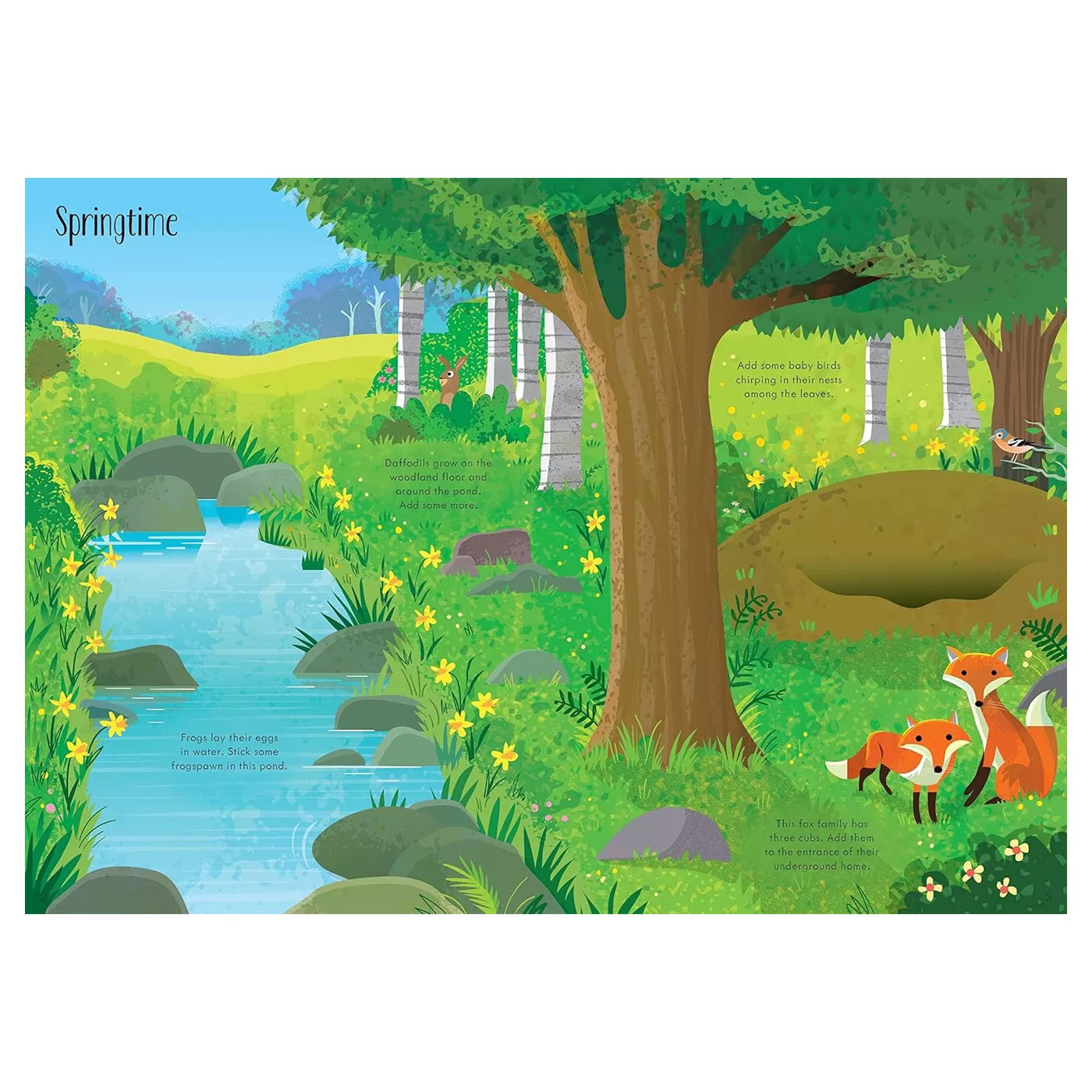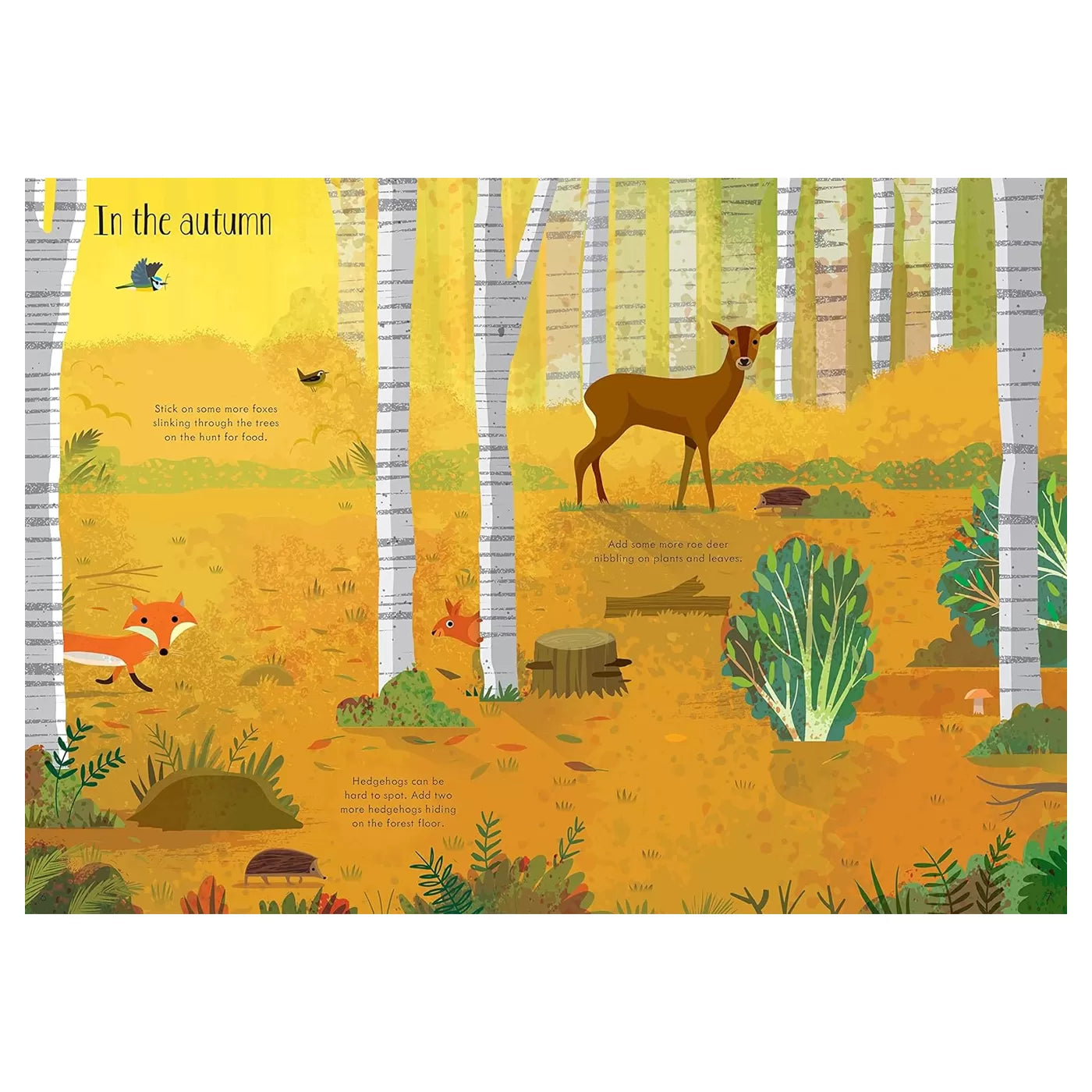 Güzel resimli bu kitap, geyikler, tilkiler, sincaplar, porsuklar ve daha birçok orman canlısıyla süslenip doldurulacak manzaralarla dolu. Çocuklar her sayfayı canlandırmak için çıkartmaları kullanabilir.