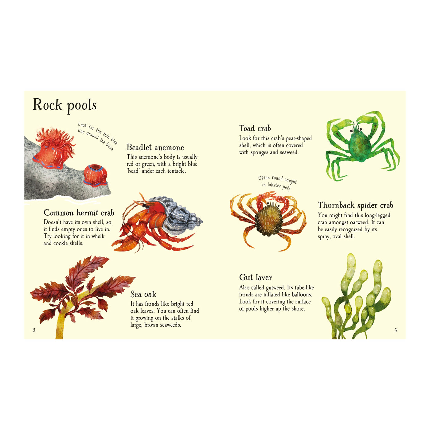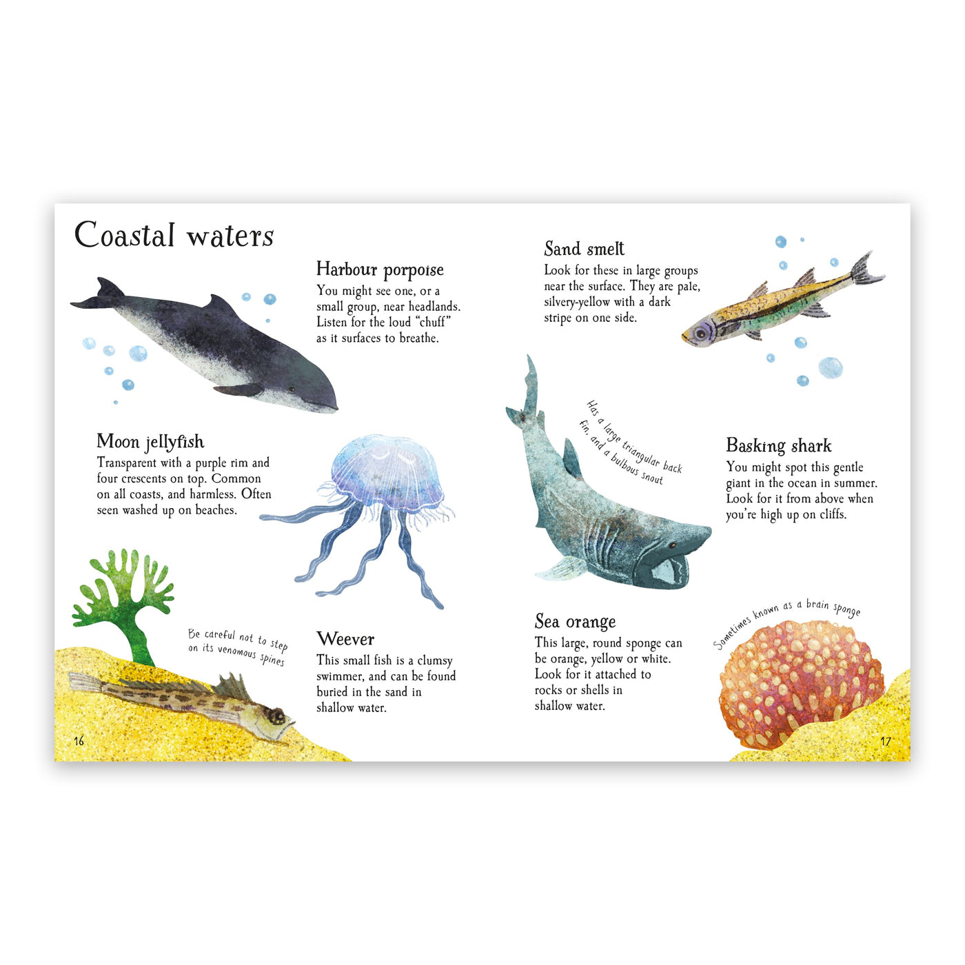 Bu keyifli küçük kitap, okuyucuların martılardan ve güneşlenen köpekbalıklarından deniz kutsallarına ve keşiş yengeçlerine kadar 60 farklı kıyı yaşamını tanımlamasına yardımcı olur. Sayfalar, kum ve çakıllı plajlarda, kayaların arasında, sığ sularda ve kayalıkların yakınında bulabileceğiniz yaratıkları ve bitkileri gösteren konuma göre sıralanmıştır. Ayrıca, tespit ettiğiniz her şeyi takip edebilmeniz için eklemeniz gereken bir tespit çizelgesi ve çıkartmalar da bulunmaktadır.