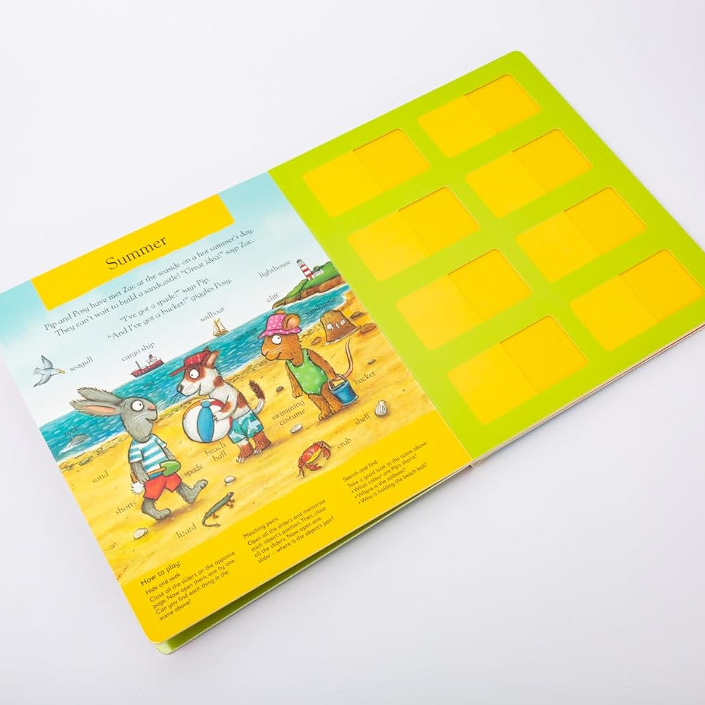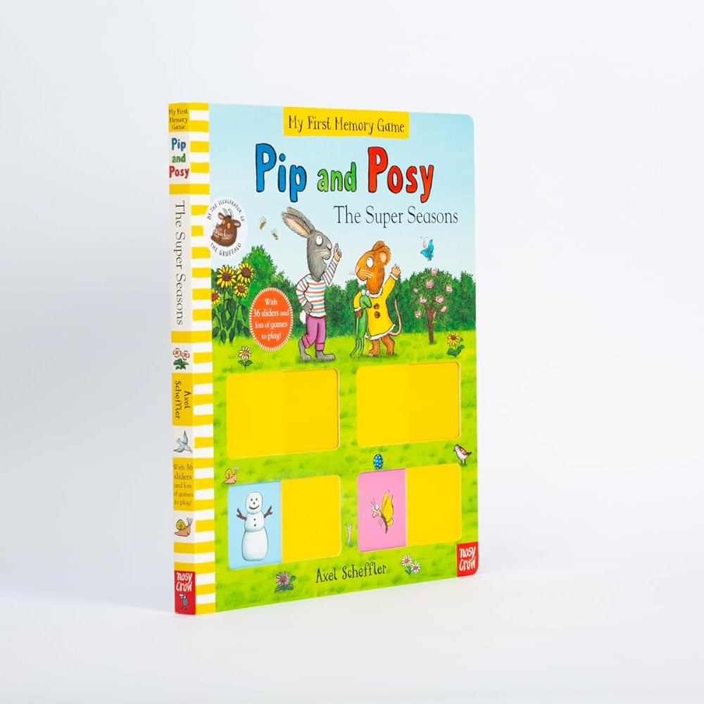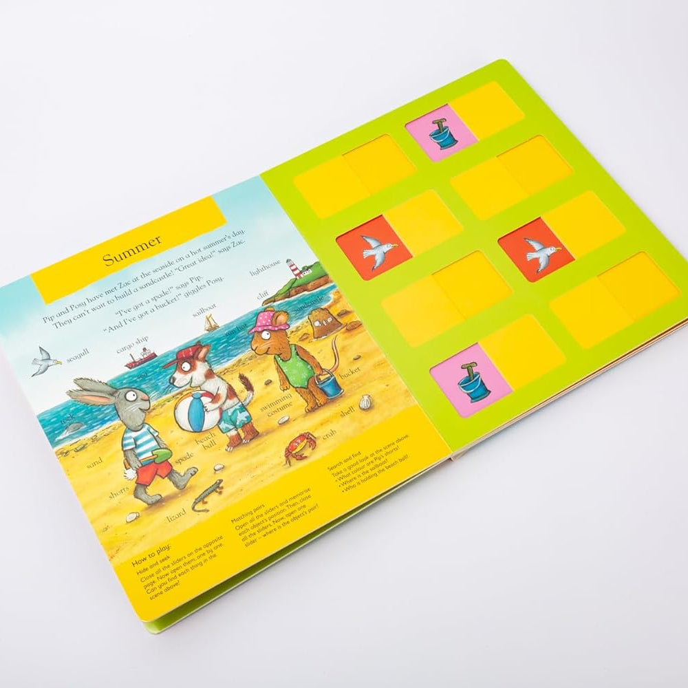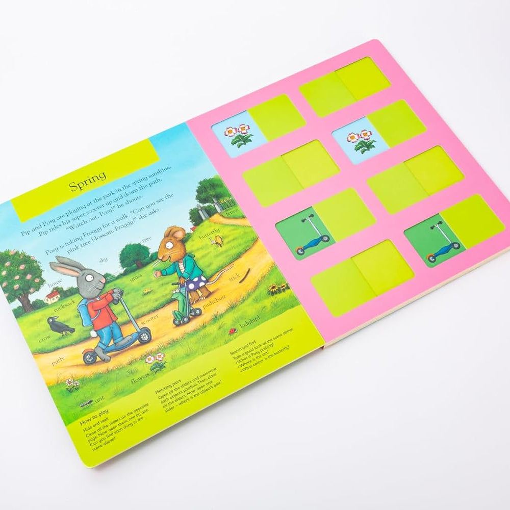 Pip and Posy: The Super Seasons (Memory Game Book), dört mevsimi renkli ve eğlenceli sahnelerle tanıtan; sürgülü mekanizmalar, oyunlar ve hafıza etkinlikleriyle çocukların hem öğrenmesini hem oynamasını sağlayan interaktif bir board book. Mevsimlerle ilgili kelime dağarcığını genişletirken hafıza, dikkat ve gözlem becerilerini destekliyor — oyun ve öğrenme bir arada.