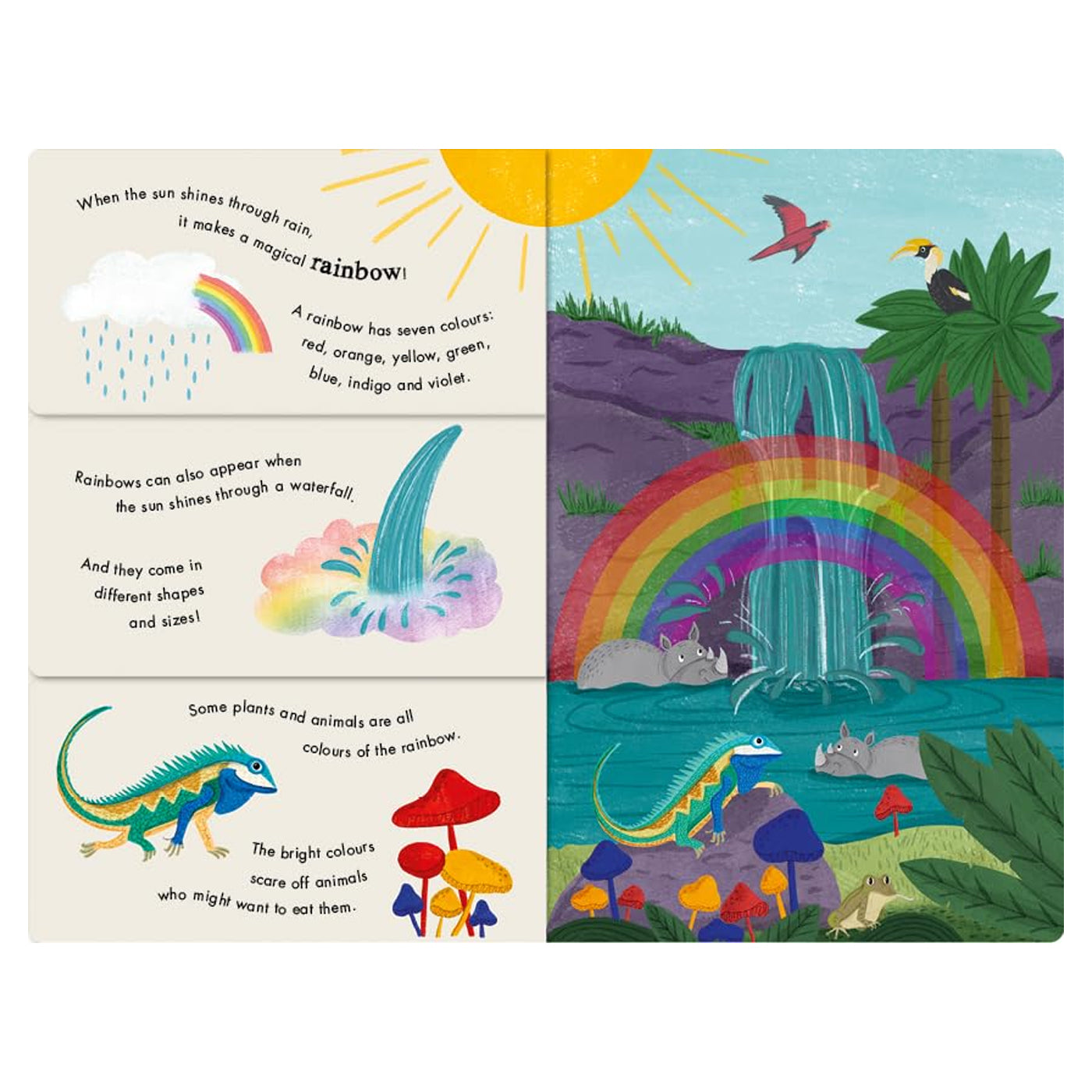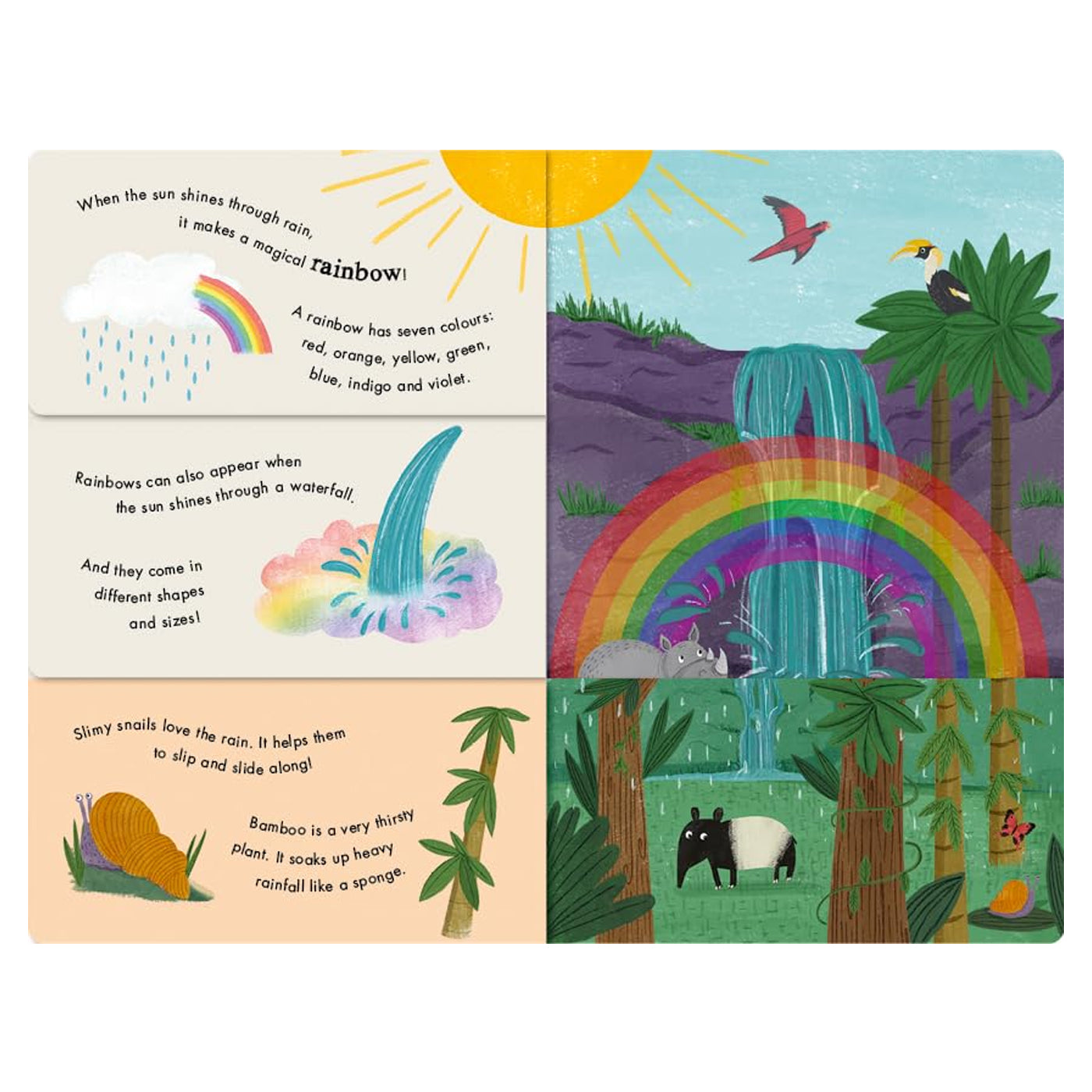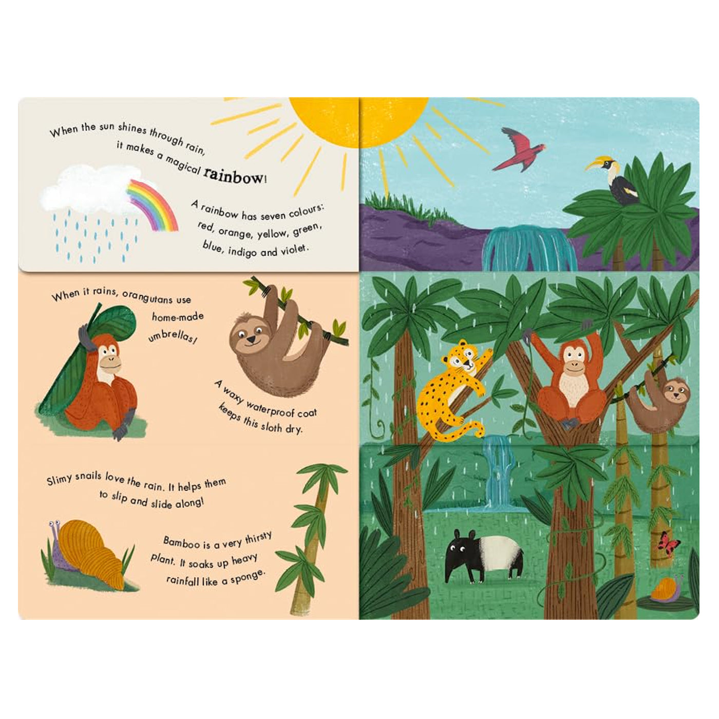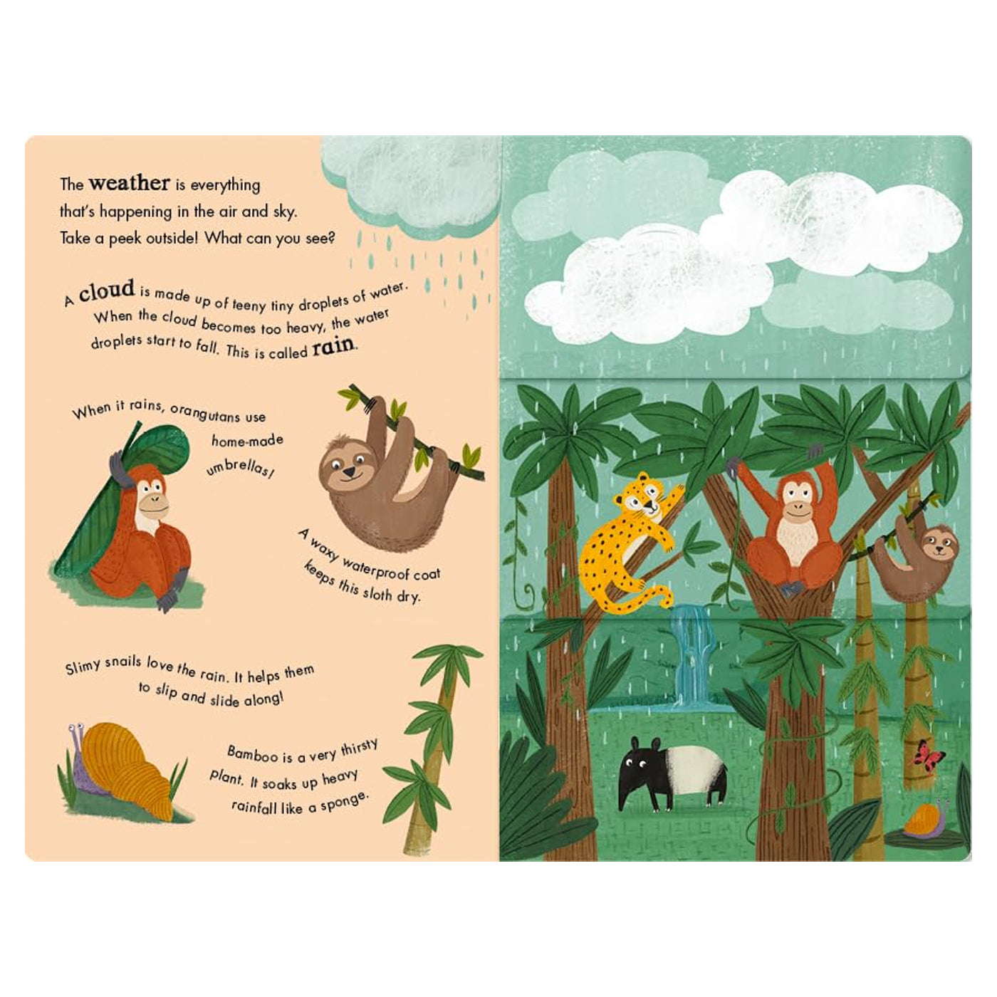 Minik eller, sahneleri değiştirmek ve hava durumu dünyasındaki değişimleri ortaya çıkarmak için bölünmüş sayfaları çevirmeyi sevecek. Her sahnede, ön sayfada dikkat edilmesi gereken çarpıcı sanat eserleri, erişilebilir bilgiler ve yaban hayatı yer alıyor. Güneş, yağmur, kar ve fırtınalarla ilgili kısa bilgiler ve mevsimlerle ilgili bir bölüm içeren bu kitap, küçükler için mükemmel bir ilk hava durumu kitabıdır.