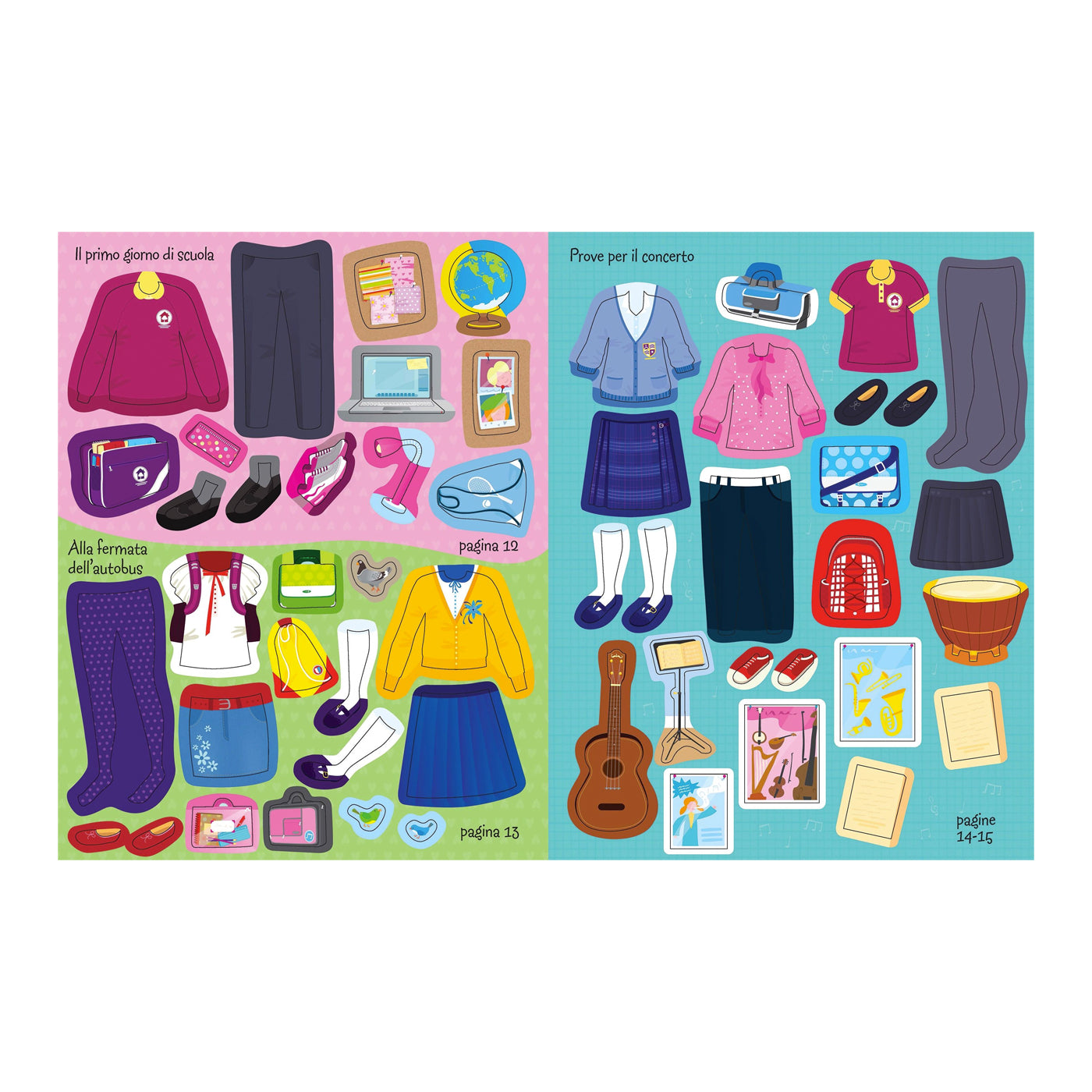 Giysilerini ve ekipmanlarını bularak ve yerlerine yapıştırarak çıkartmalar ile kızların okula hazırlanmasına yardımcı olun.