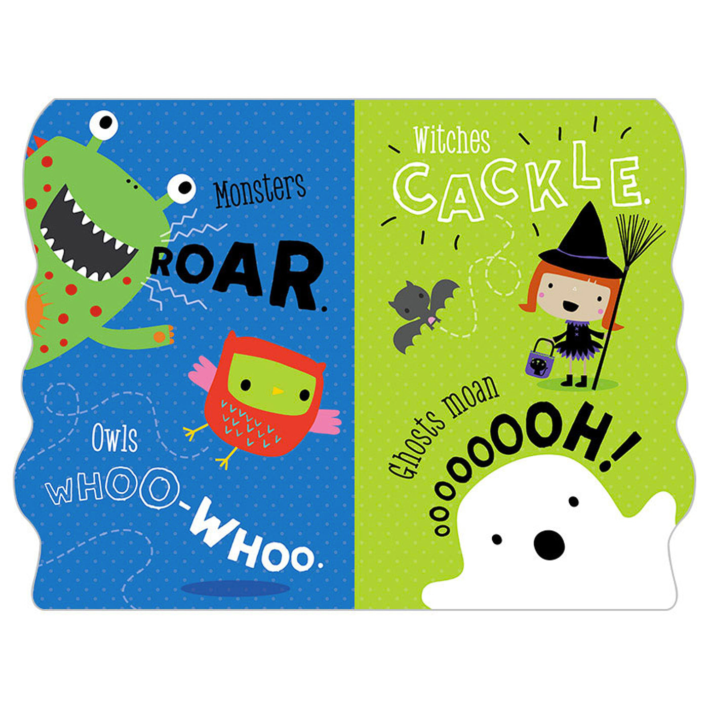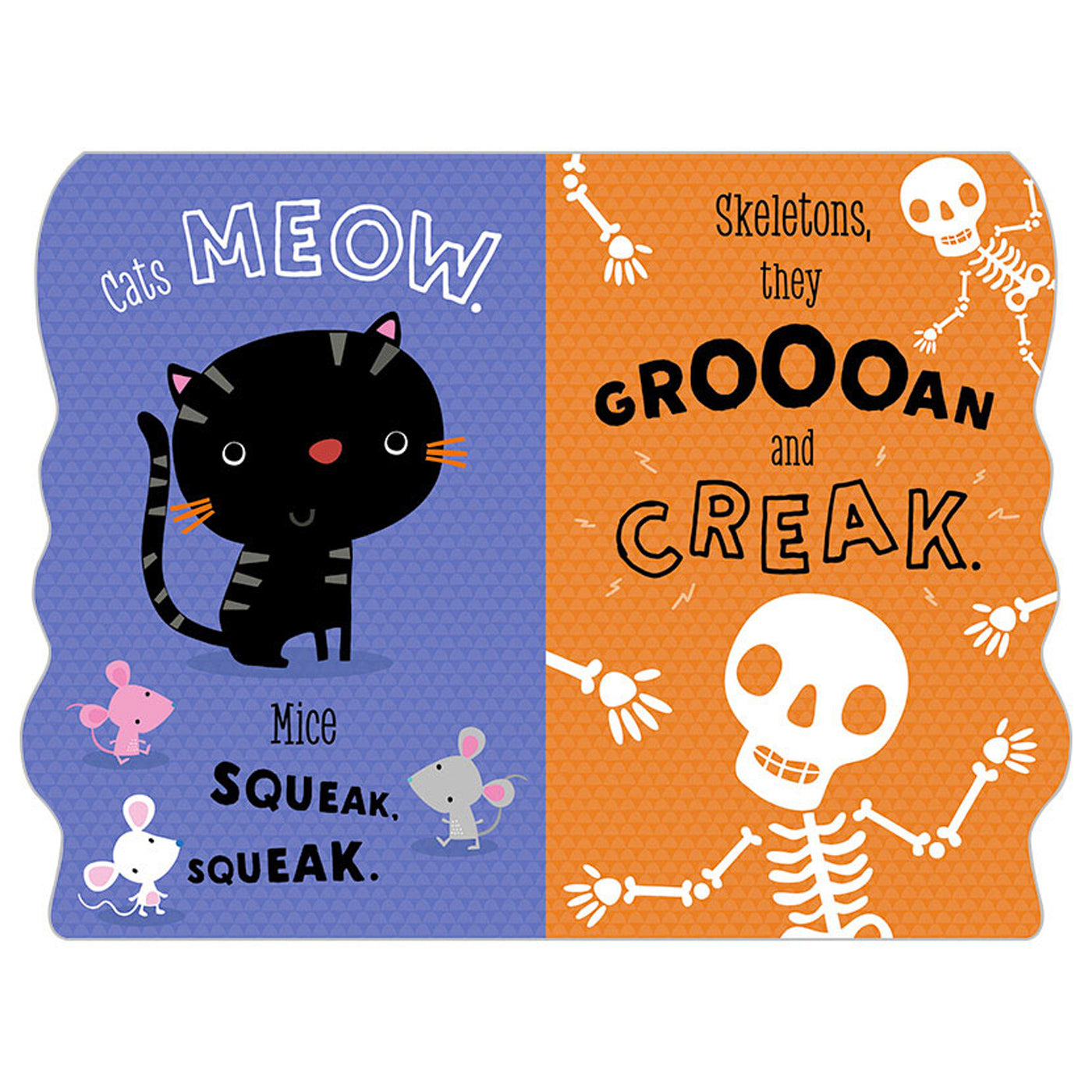 Minik ellerin tutmayı seveceği şekilli köpük sayfalarıyla ürkütücü seslerden oluşan bu kitapta çeşitli Cadılar Bayramı karakterlerinin çıkardığı sesler hakkında basit metinler yer alıyor. Dawn Machell'in sevimli illüstrasyonları bu sevimli Cadılar Bayramı kitabına eşlik ediyor.