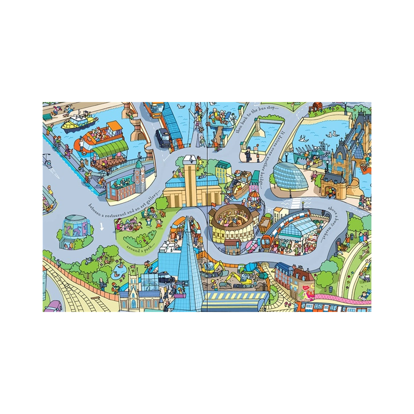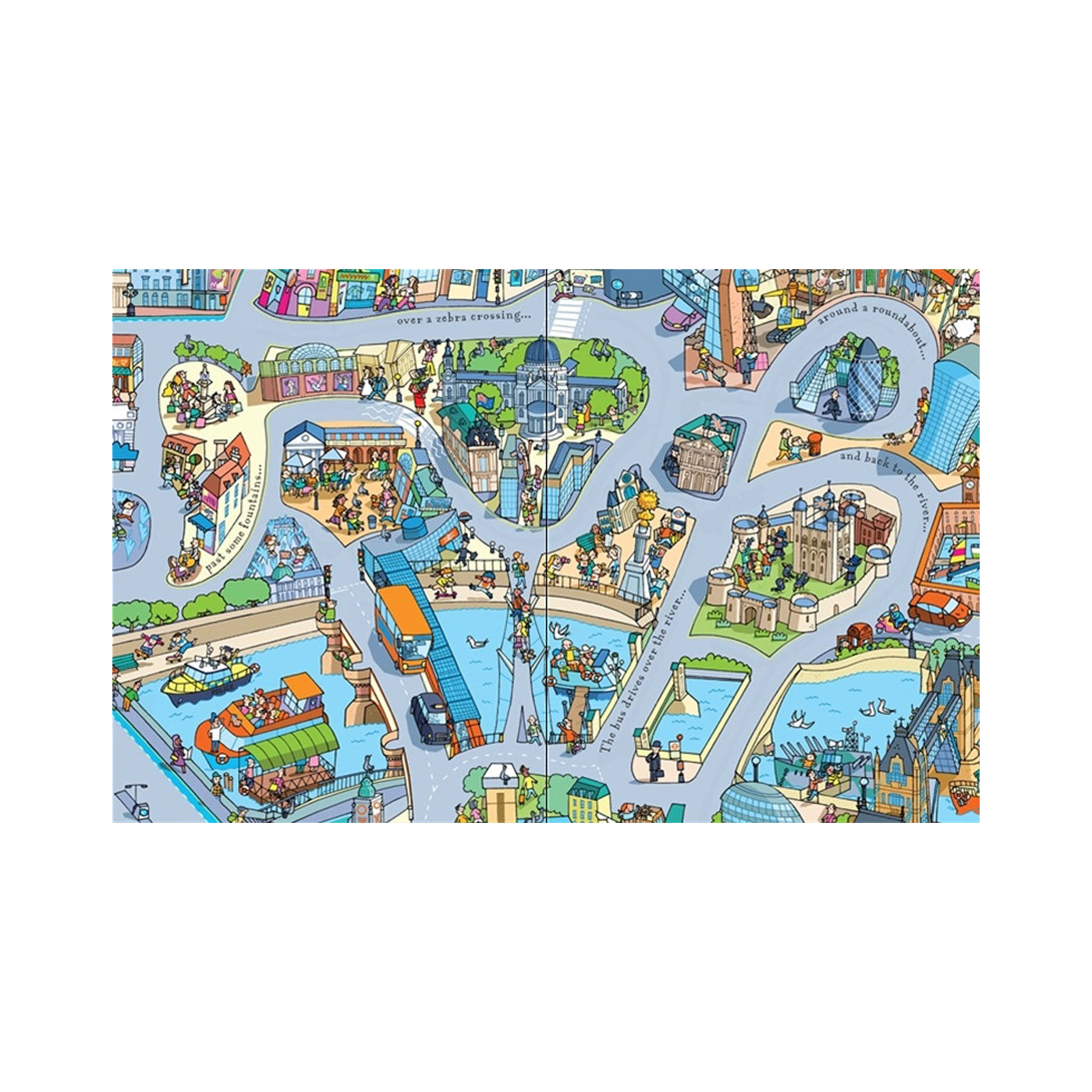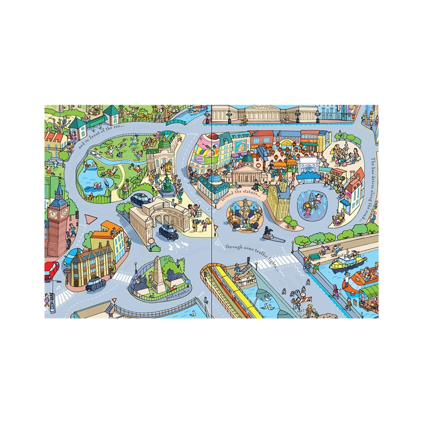 Kırmızı, çift katlı bir Londra otobüsünün ve dört yolun rüzgarlı bir modeli sizi ünlü şehirde bir tura çıkarır. Otobüsünüz yolda dururken Londra'nın en ünlü simge yapılarını ve ilgi çekici yerlerini öğrenebilirsiniz. Kitabın içindeki yollar aynı zamanda çıkarılabilir ve dört parça kitaptan çıkarılarak otobüsün etrafta dolaşması için büyük bir yol oluşturmak üzere birleştirilebilir.