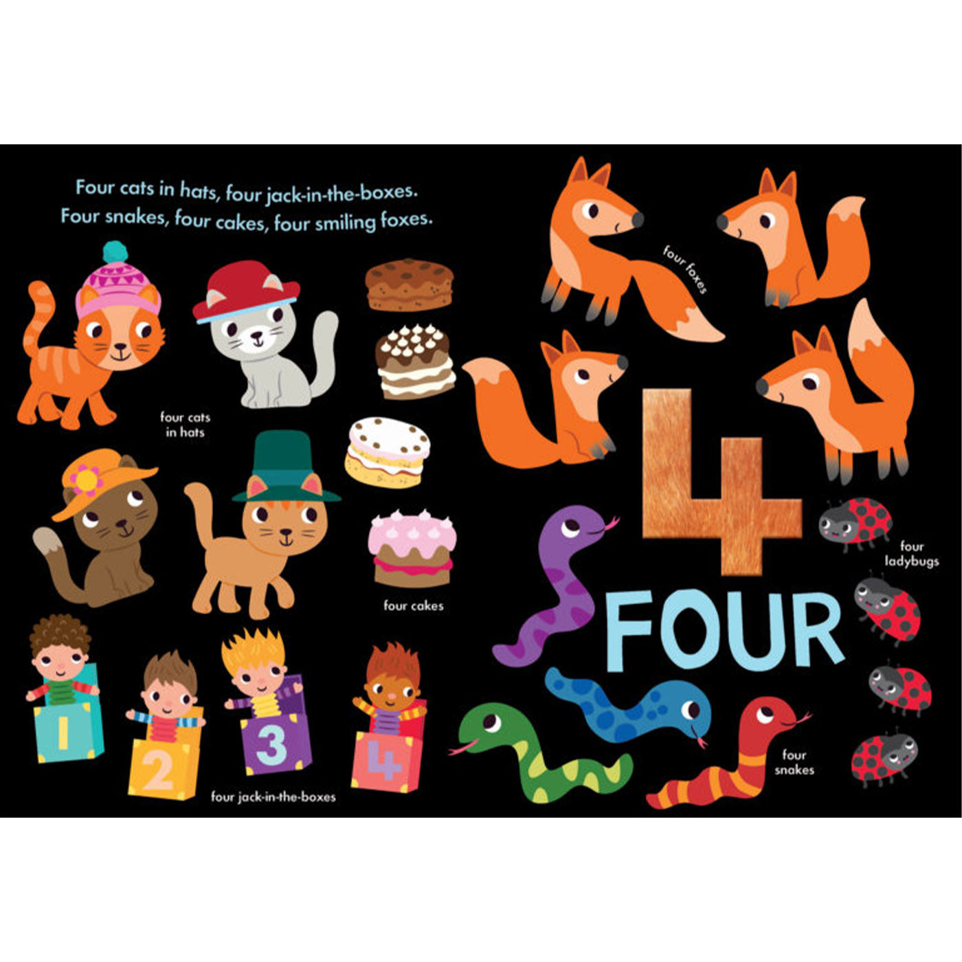 Kafiyeli metinleri, eğlenceli karakterleri ve baştan sona dokun ve hisset öğeleri bulunan bu sevimli küçük kitap ile küçükler, sayıları ve ilk kelimeleri öğreniyorlar.