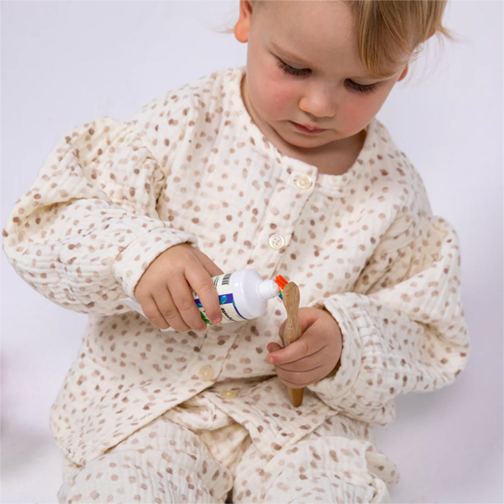 SLS, paraben, şeker ve titanyum dioksit içermeyen bu diş macunumuz, çocukların hassas ağız yapısına uygun olarak geliştirilmiştir. Doğal tatlandırıcı olarak xylitol ve sorbitol kullanılmıştır.