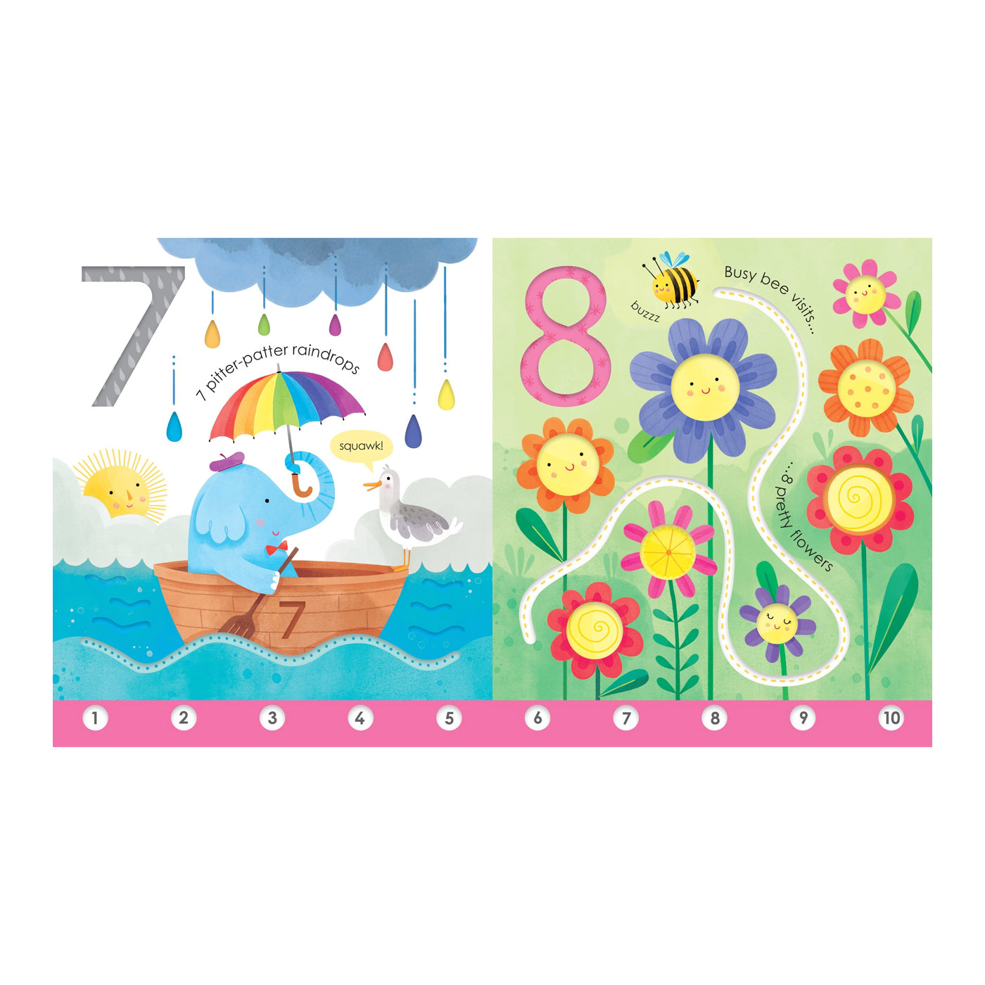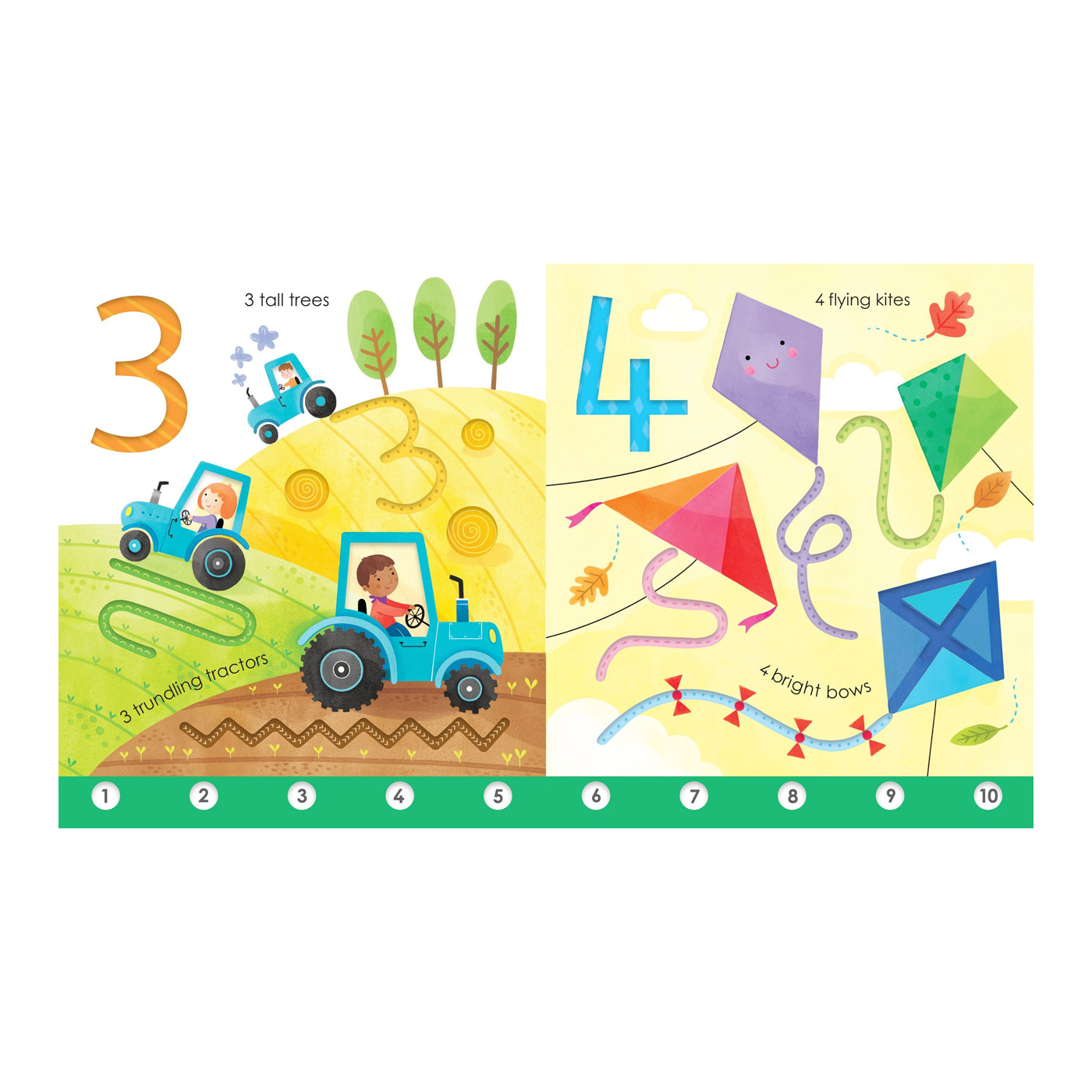 Bu keyifli kitap, muhteşem çizimleri, takip edilecek parmak izleri ve tekrarlayan metinleri ile küçük çocukların sayı adlarını ve şekillerini öğrenmelerine yardımcı oluyor.