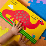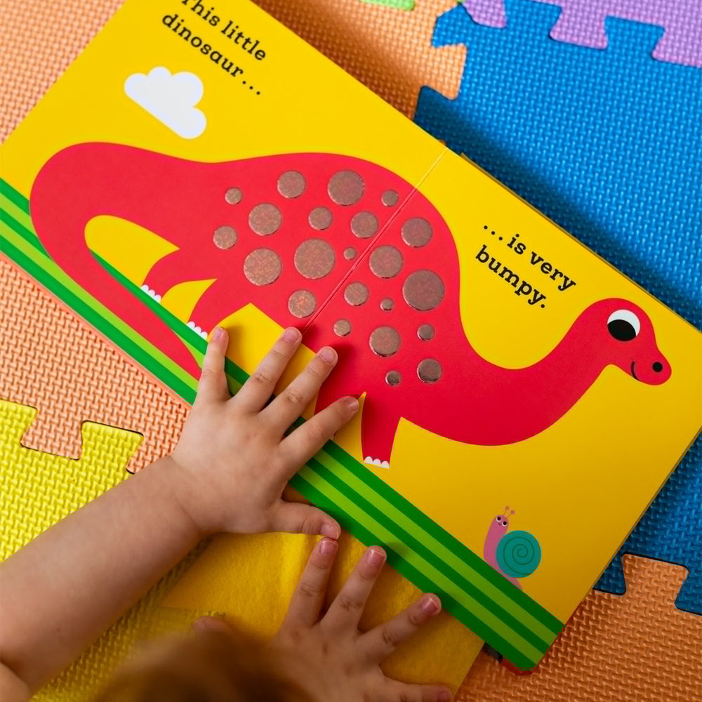 This Little Dinosaur, bebekler ve küçük çocuklar için dokun-hisseli (touch-and-feel) bir board book. Sayfalardaki farklı dokular sayesinde minikler dinozor derisi, tüyleri ya da yeşil yaprakları hissederek keşif yaparken, duyusal gelişim ve merak duygusu desteklenir. Bu etkileşimli kitap, hem duygusal bağ kurmayı hem de dokunsal farkındalığı teşvik eder.