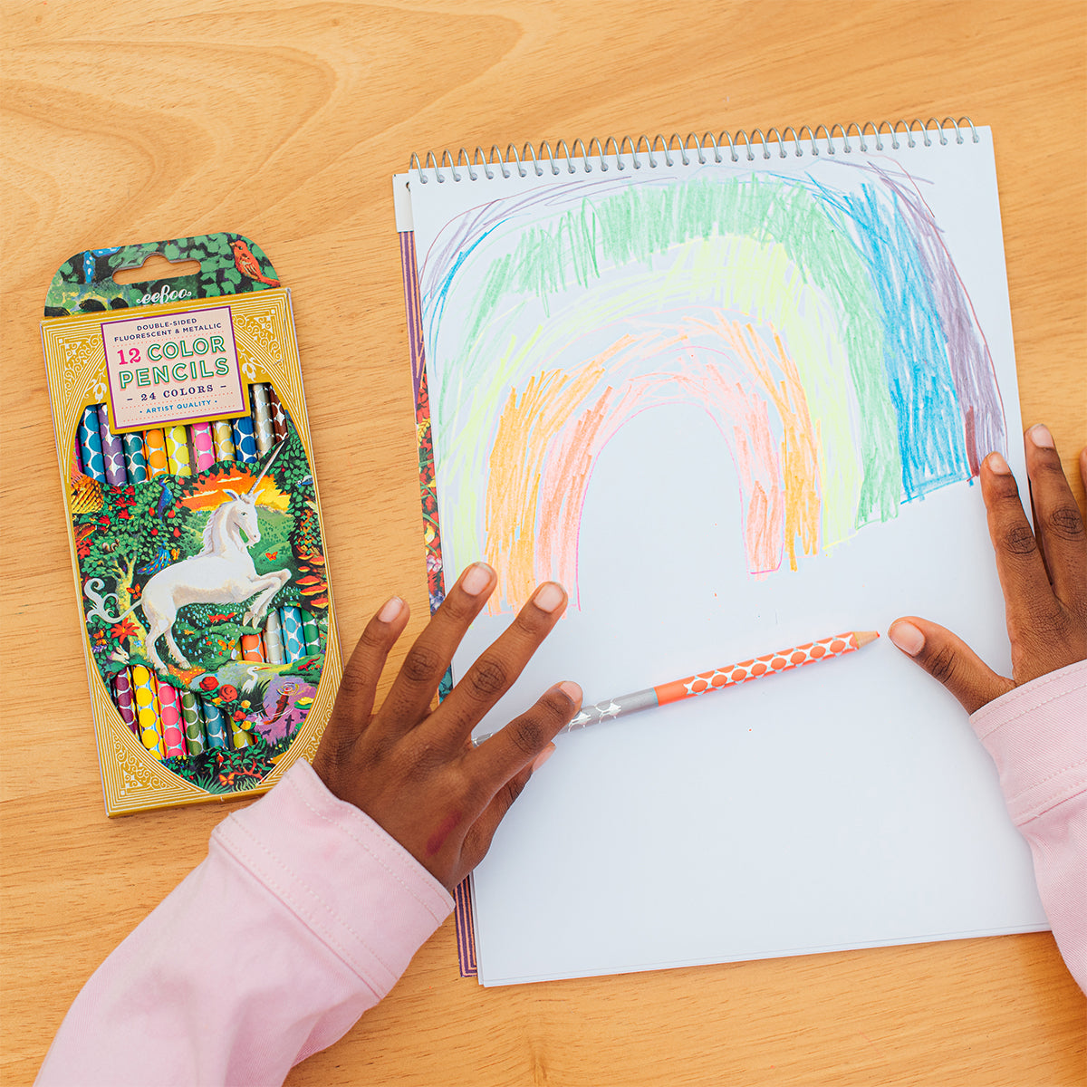 Eeboo Çift Uçlu 24 Renk Kuru Boya Kalemi - Unicorn Garden, unicorn bahçesi temalı neşeli illüstrasyonlarla süslenmiş çift renkli kurşun kalemlerden oluşur. Her kalemin iki ucu farklı renktedir; bu sayede 12 kalemde toplam 24 renk seçeneği sunar ve çizim ile boyama etkinliklerine ekstra renk çeşitliliği katar. Kalemler sağlam yapıda üretilmiştir ve çocukların yaratıcılığını destekleyen keyifli bir sanat malzemesi seçeneğidir.