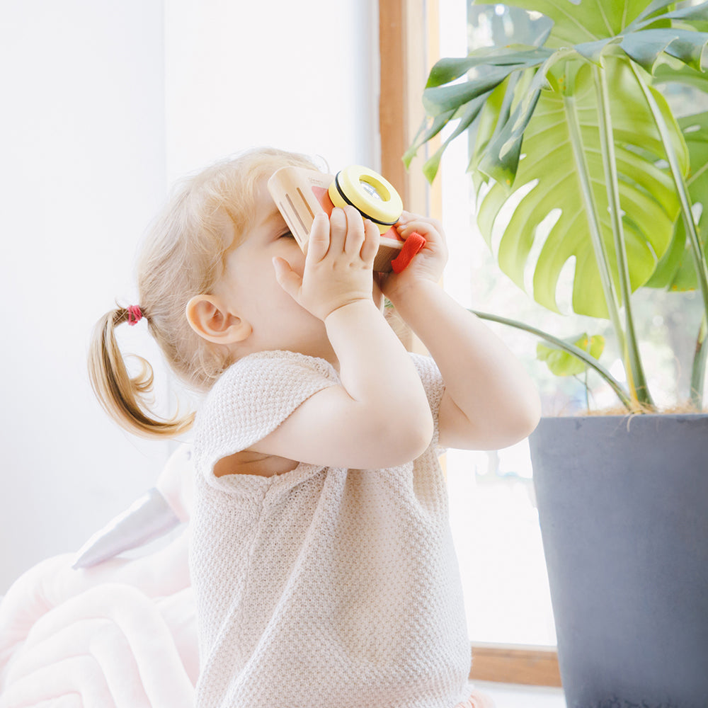 Gülümseyin ve tıklayın! Vintage tasarımlı bir gövde, dönen bir kaleydoskop lensi ve deklanşör düğmesiyle Classic World Ahşap İlk Kameram oyuncağına küçükler bayılacak! Kamera, çoklu prizma lensi aracılığıyla çocukların yeni bir dünya keşfetmesini sağlarken, sağlam kayış ise kamerayı diledikleri yere yanlarında götürmelerini kolaylaştırıyor.