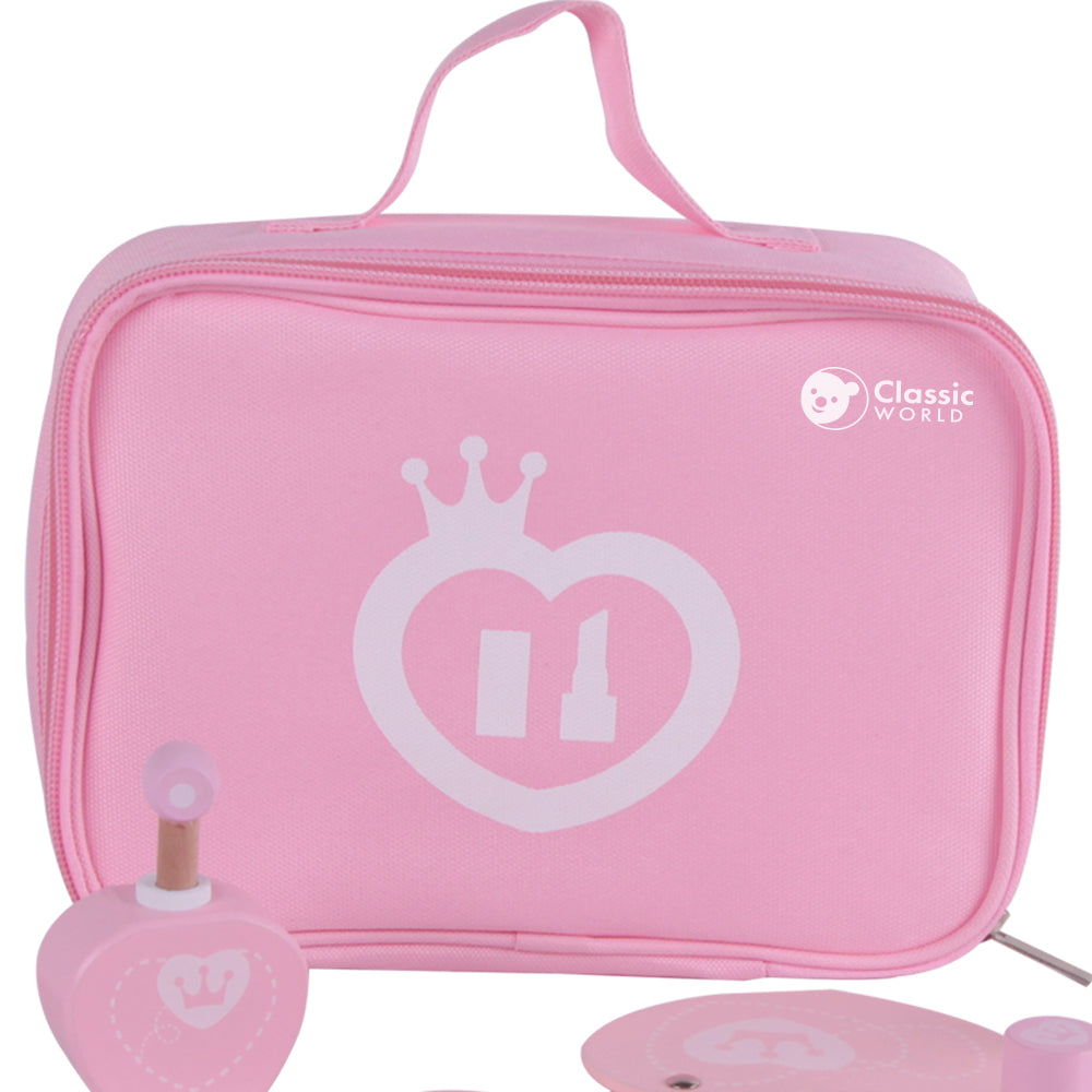Çocuklar için sevimli bir makyaj oyuncak seti! Classic World Ahşap Makyaj Seti, içinde fırça bulunan bir far paleti, ruj, oje şişesi, parfüm şişesi, ayna, tarak, saç kurutma makinesi, makyaj talimatları broşürü ve taşınabilir bir el çantası içeriyor. Bu ahşap güzellik kiti, çocukların hayal güçlerinin gelişmesine yardımcı olur, problem çözme becerilerini geliştirir ve ince motor becerilerini de destekler.