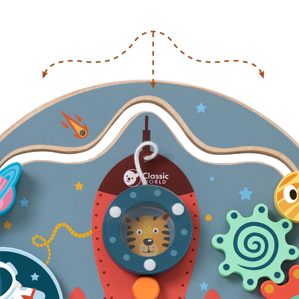 Classic World Ahşap Roket Oyun Tahtası, labirent, döner bloklar, dişliler ve boncuk oyununu bir araya getiriyor. Çocuklar, bu eğlenceli aktivitelerin tadını çıkarırken deniz hayvanlarının isimlerini de öğreniyor.