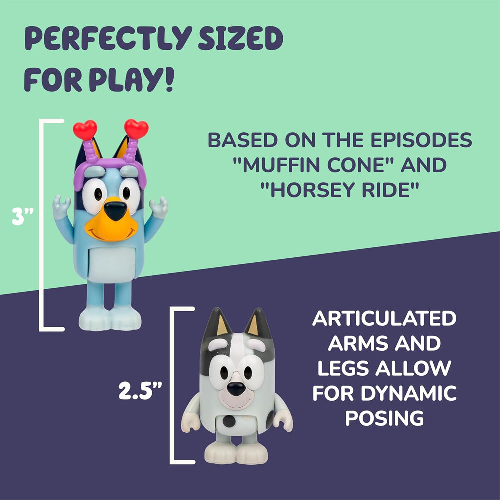 Bahar Hikayesi Anlatımı Eğlencesi: "Muffin Cone" ve "Horsey Ride" bölümlerinden ilham alan Bluey ve Muffin Bluey figürin setiyle eve bahar neşesi getirin! Sevimli aksesuarlar giymiş bu Bluey karakter oyuncakları güneşli arka bahçe maceraları sunar