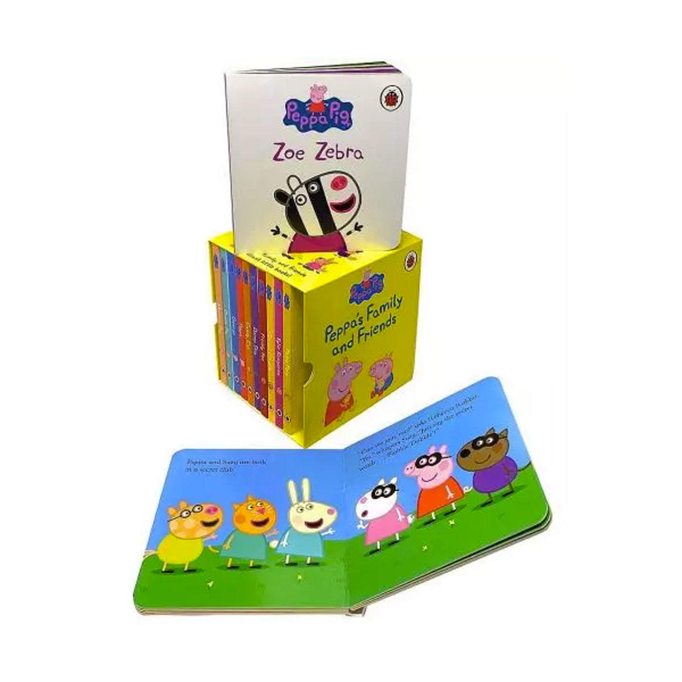 Peppa arkadaşlarını çok seviyor. Bu setin içinde yer alan 12 küçük kitapla, Peppa'nın ailesi en sevdiği arkadaşları ile tanışabilirsiniz. Zoe Zebra, Suzy Sheep, Pedro Pony, Kylie Kangaroo, Gerald Giraffe, Freddy Fox, Danny Dog, Candy Cat, Peppa, George, Daddy Pig ve Mummy Pig bu setle çocukları bekliyor.