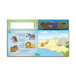 Aslan, su aygırı, fil ve daha birçok hayvan keşfedilmeyi bekliyor! Çocuklar, tekrar kullanılabilinen keçe oyun parçalarıyla farklı sayfalarda istedikleri hikayeyi yaratabilirler. Yeniden kullanılabilir oyun parçaları parlak sayfalara kolayca yapıştırılıp çıkartılabilir. Böylece tekrar tekrar kullanılabilir. Oyun bittiğinde, yumuşak keçe oyun parçalarını kitabın arka kapağında bulunan özel bölmede saklayabilirsiniz.