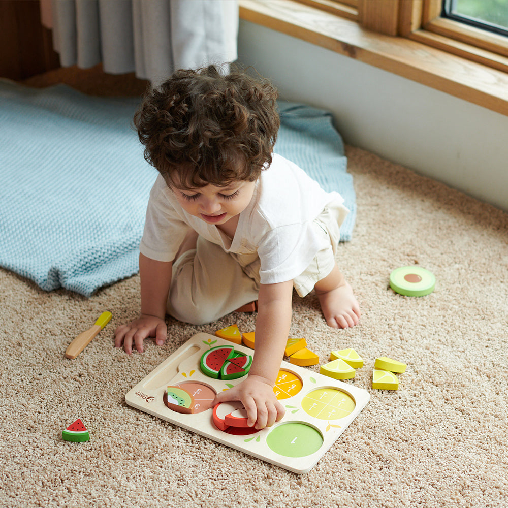Meyve yapbozu elma, kivi, limon gibi 6 renkli meyveden oluşur. Bu meyveler yarım, üçte bir gibi parçalara bölünmüştür. Çocuklar, meyve kesme oyunu oynarken kesirler hakkında matematiksel kavramları öğrenebilirler.