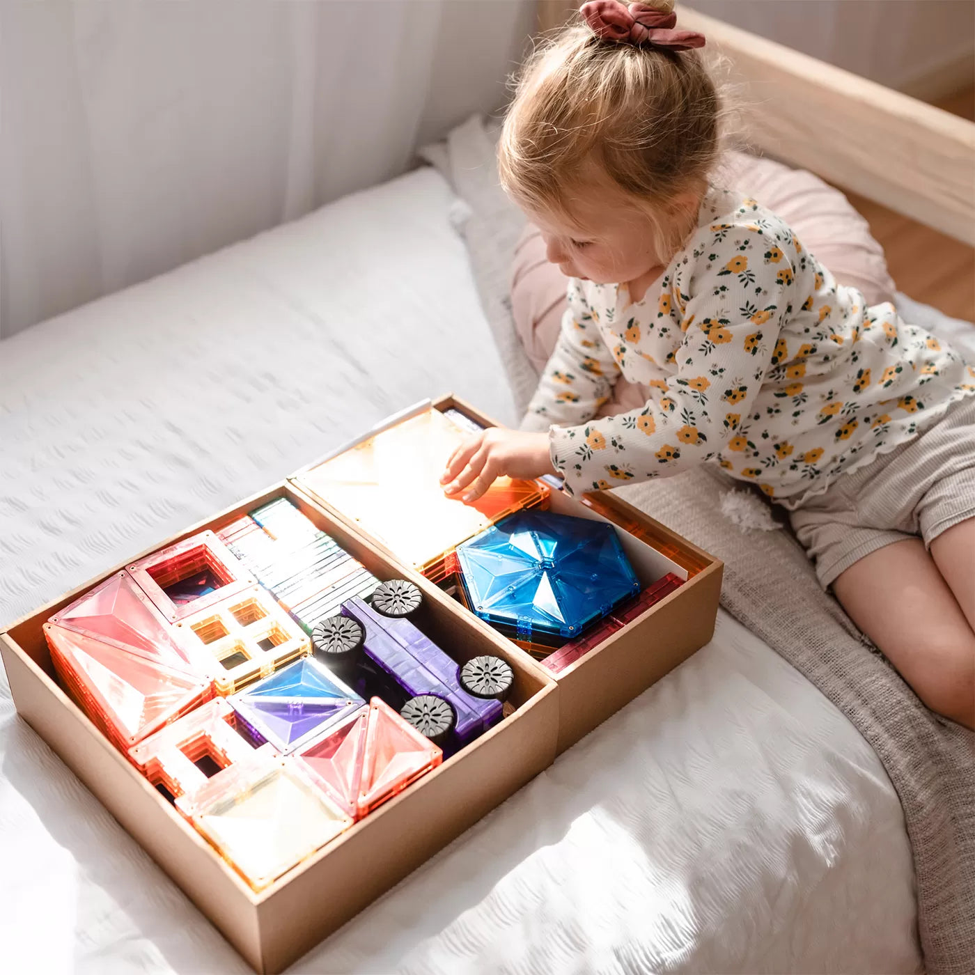 Çocukların hayal güçlerini kullanmalarına, oyunlarında liderliği ele almalarına ve en eğlenceli gökkuşağı temalı yapıları yaratmalarına olanak tanıyan 212 parçalık bu paket, farklı renk ve şekillerde manyetik bloklar içeriyor.