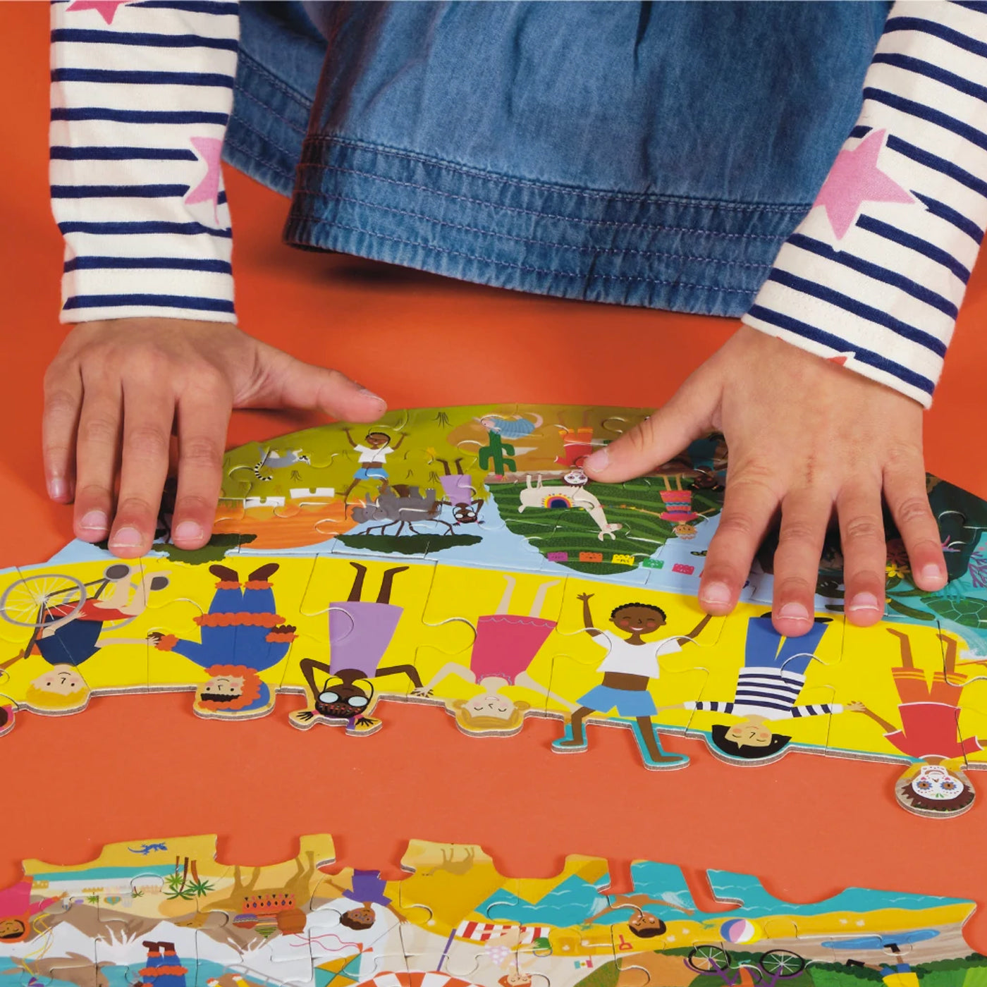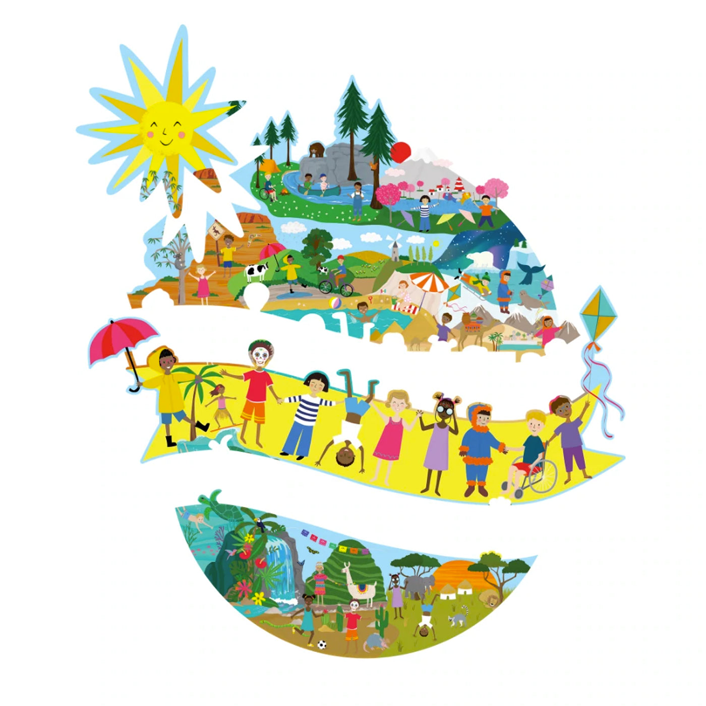 100 parçalı yapbozumuz, hepsi tek bir yapbozda bütünleşen üç ayrı yapbozdan oluşur. 12 parçalı daha büyük iki yapboz, merkezle birleşerek 100 parçalık muhteşem bir yapboz oluşturur. Keyifli çeşitlilikteki Tek Dünya sahnemiz sizi dünya kültürlerinde bir yolculuğa çıkarıyor, farklı ekosistemleri keşfediyor ve yol boyunca yeni arkadaşlarla tanışıyor! 3'ü 1 arada bulmacayı tamamladığınızda, yeniden kullanılabilir kutusuna geri koyabilir ve parlak renkli tutacağı kullanarak bir sonraki maceranıza atabilirsiniz.