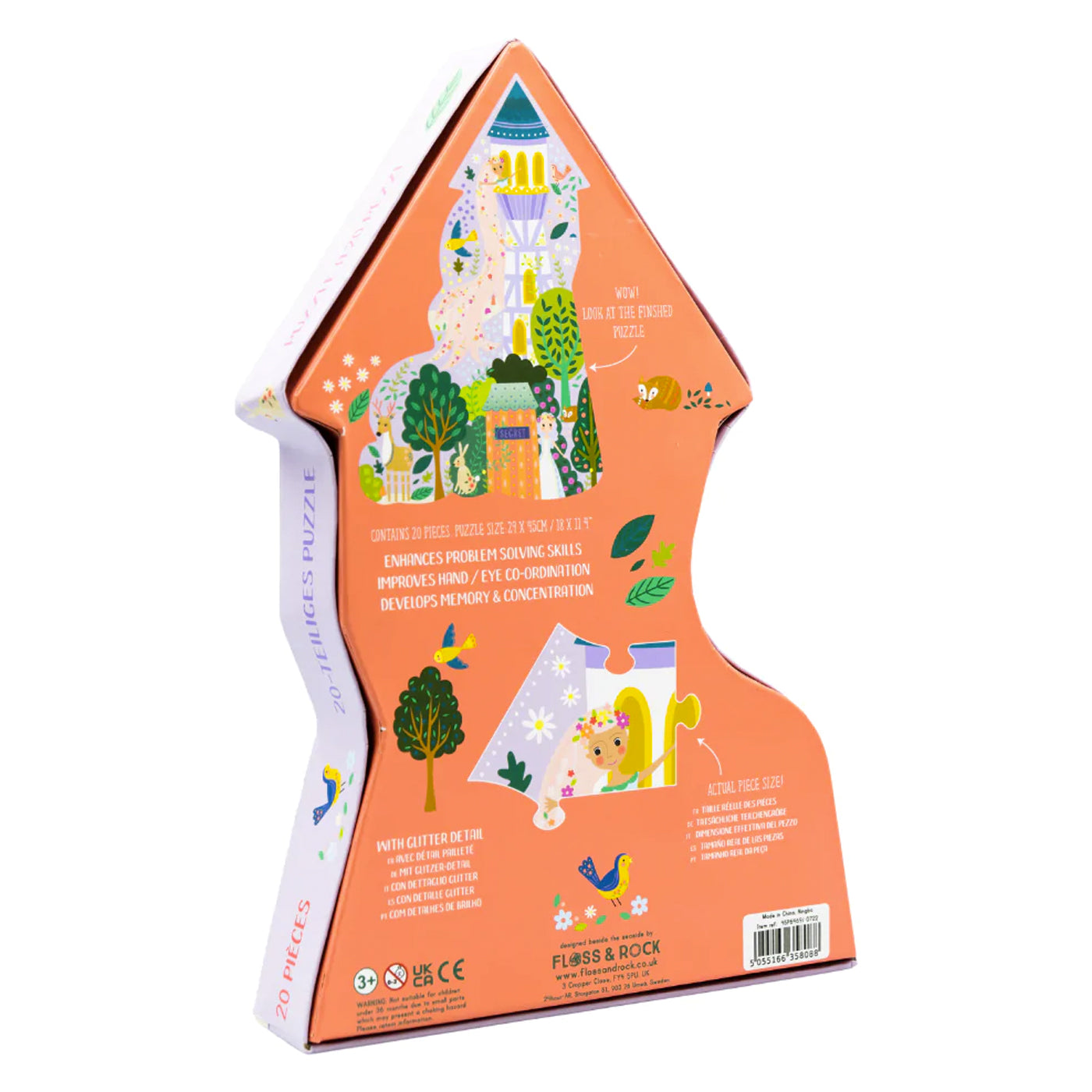 Kutusu gibi kendisi de aynı şekli alan Floss & Rock 20 parçalı yapboz tamamlandığında Prenses şekli ortaya çıkmaktadır ve Fairy Tale üzerinde koleksiyonundaki tüm eğlenceli detayları göreceksiniz. Hem kutu hem de yapboz parçaları, ekstra özel bir dokunuş katmak için parlak folyo kaplama detayına sahiptir.