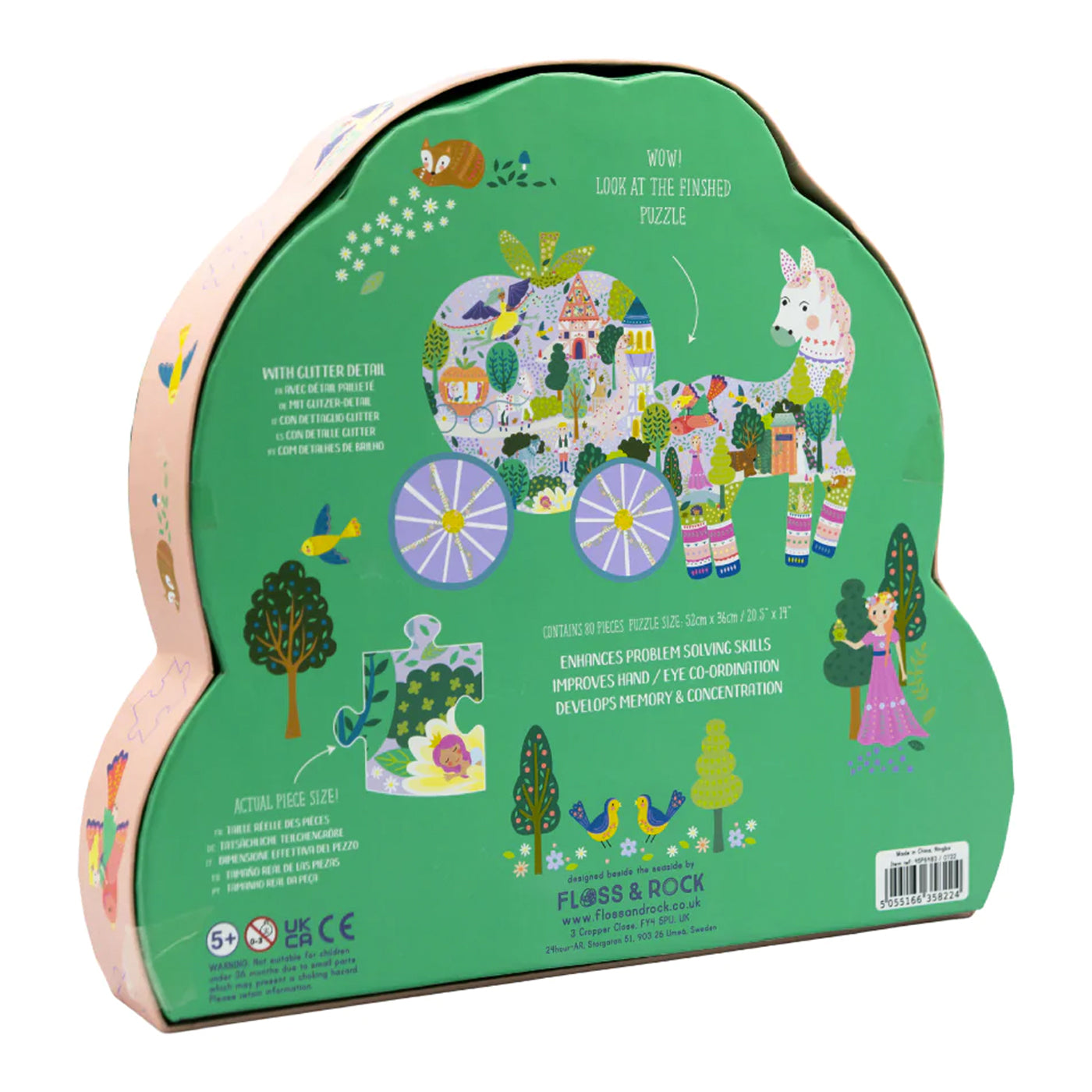 Sadece kutusu değil, yap-boz da şekilli! Floss & Rock80 parçalık yap-boz tamamlandığında ‘Bal Kabağı Araba’ şeklini oluşturur ve Peri masalı koleksiyonundaki tüm ilgi çekici detayları içerir. Hem kutu hem de yap-boz parçaları, ekstra özel bir dokunuş katmak için parlak folyo kaplama detayına sahiptir.
