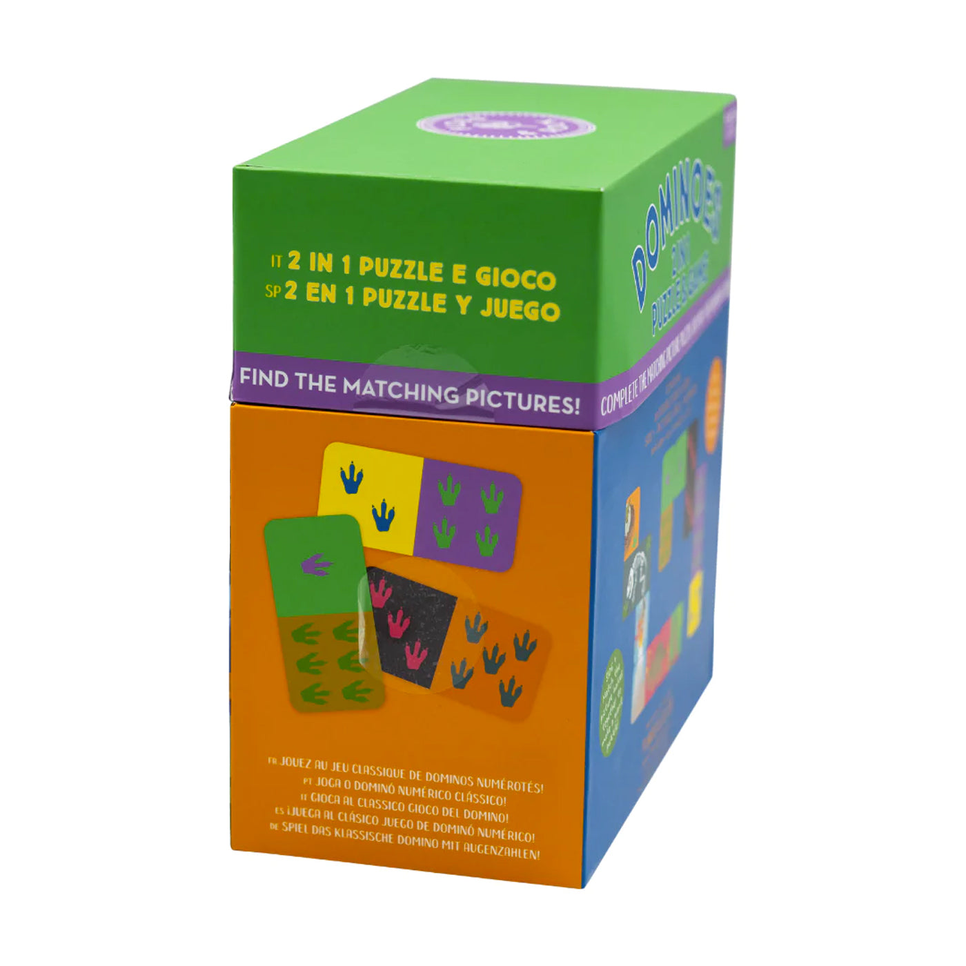 Yapboz ve Oyunun bir arada olduğu 2’si 1 arada Dino Domino, tek veya çift kişi olarak oynanabilir. Birbirleriyle eşleşen resimli bulmacayı tamamlayın veya sayı oyununu oynayın! Sağlam kutusunun içinden yeniden kullanılabilen ve üzerlerinde muhteşem Dinozor figürleri olan 28 adet çift taraflı kart çıkmaktadır. Kartların resimli taraflarını kullanarak birleştirip, şekilleri tamamlayabilirsiniz. Dinozorları, volkanları, fosilleri ve çok daha fazlasını gösteren dev bir yapboz yapabilirsiniz. Sonrasında, domino numaralarını ortaya çıkarmak için kartları ters çevirin ve bir arkadaşınızla klasik domino oyununu oynayın! Oyun süresi bittiğinde, tüm kartlarınızı kutuya düzgünce koyun ve bir sonraki oyun için kapağı tekrar açın!