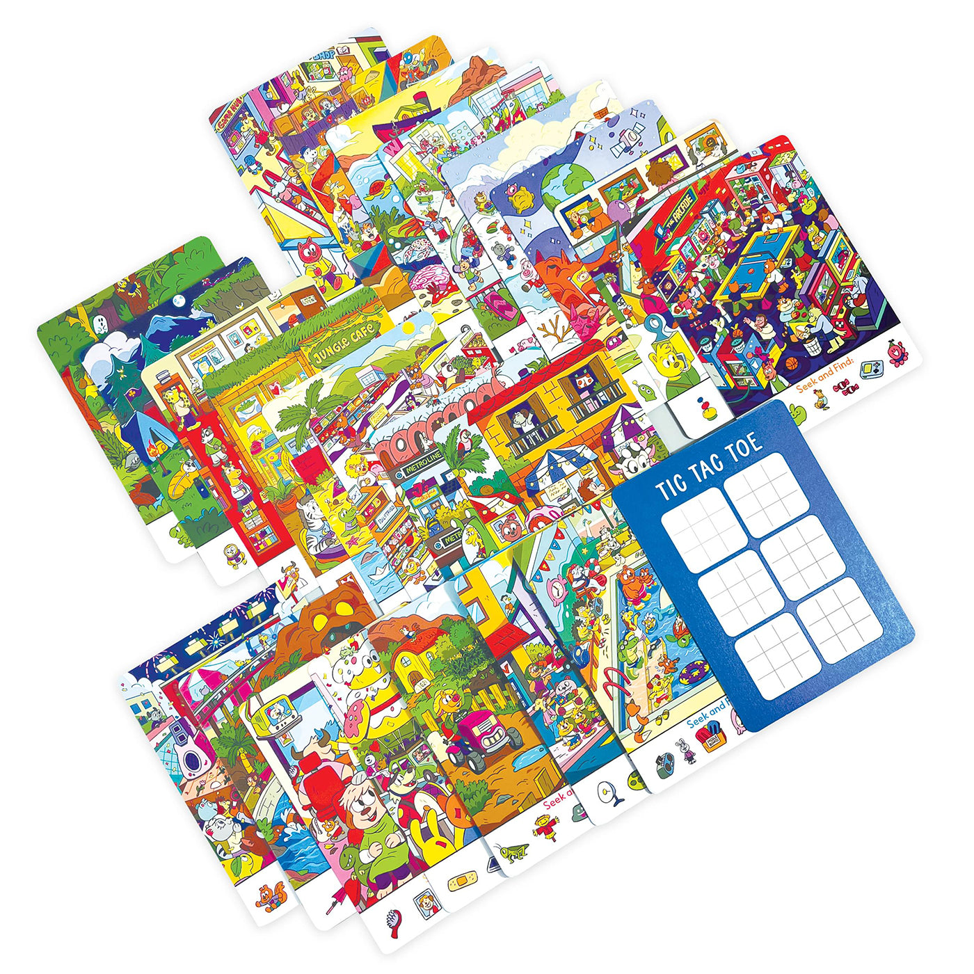 Bu arama ve bulma oyunu ile eğlence sizi bekliyor! Bu aktivite setinde farklı temalara sahip 24 farklı kart bulunuyor. İlgi çekici çizimler eşliğinde oyanan bu bu ara-bul oyunu, yağmurlu günlerde evde geçirilen zamanda ya da seyahatlere eğlence katıyor. Ayrıca her kartın arkasında tic-tac-toe oyunu da yer alıyor.