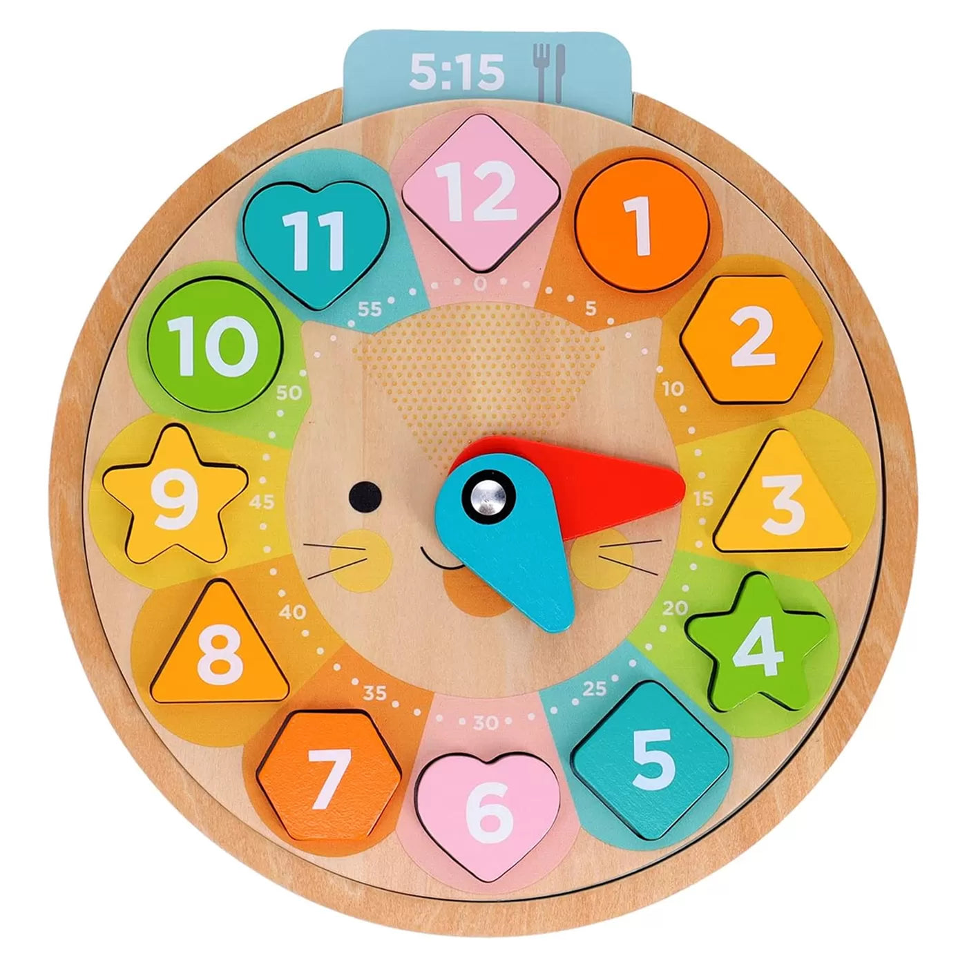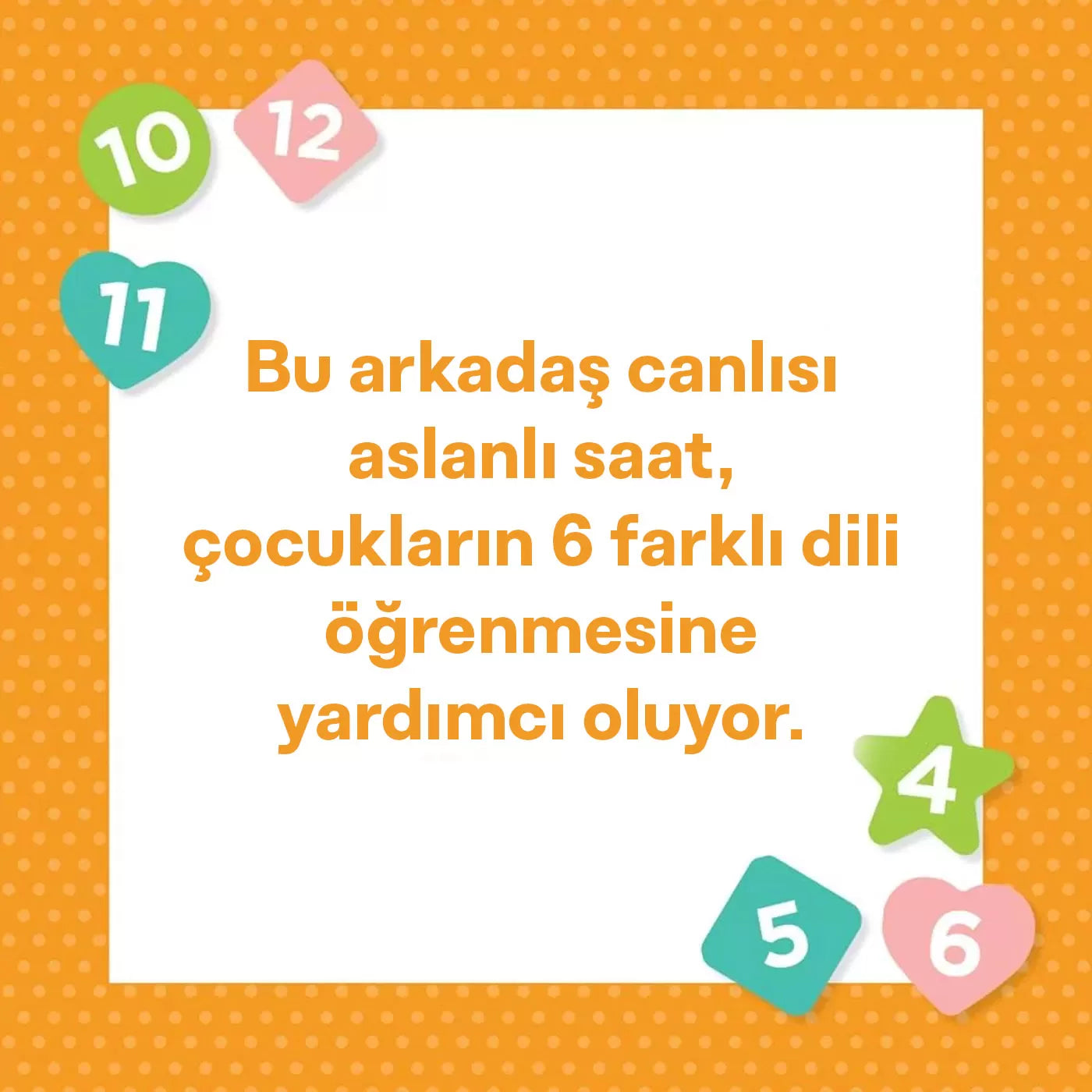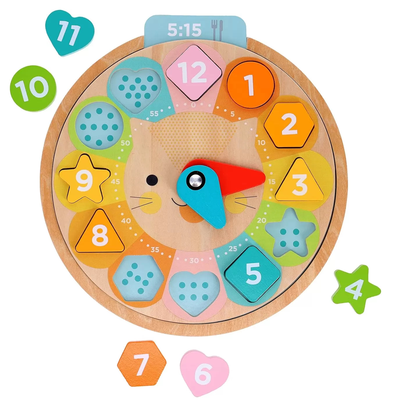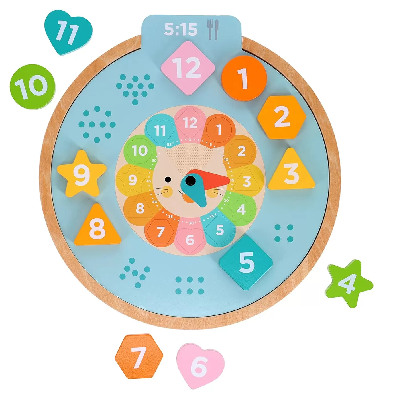 Bu sevimli aslan saat ile çocuklar, altı farklı dilde zamanı söylemeyi, sayı saymayı ve renkleri ve şekilleri öğrenecekler. Kartlardaki saatleri doğru şekilde uygulamak için saatin kollarını döndürecekler. Bu çok amaçlı ahşap oyuncakta dil kartlarını değiştirip farklı dillere geçiş yapmak çok kolay.