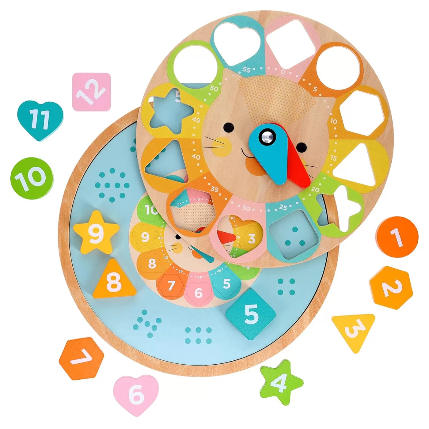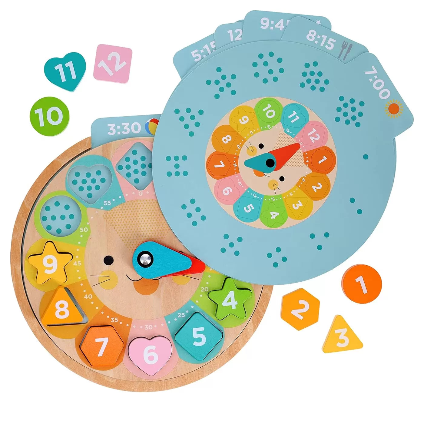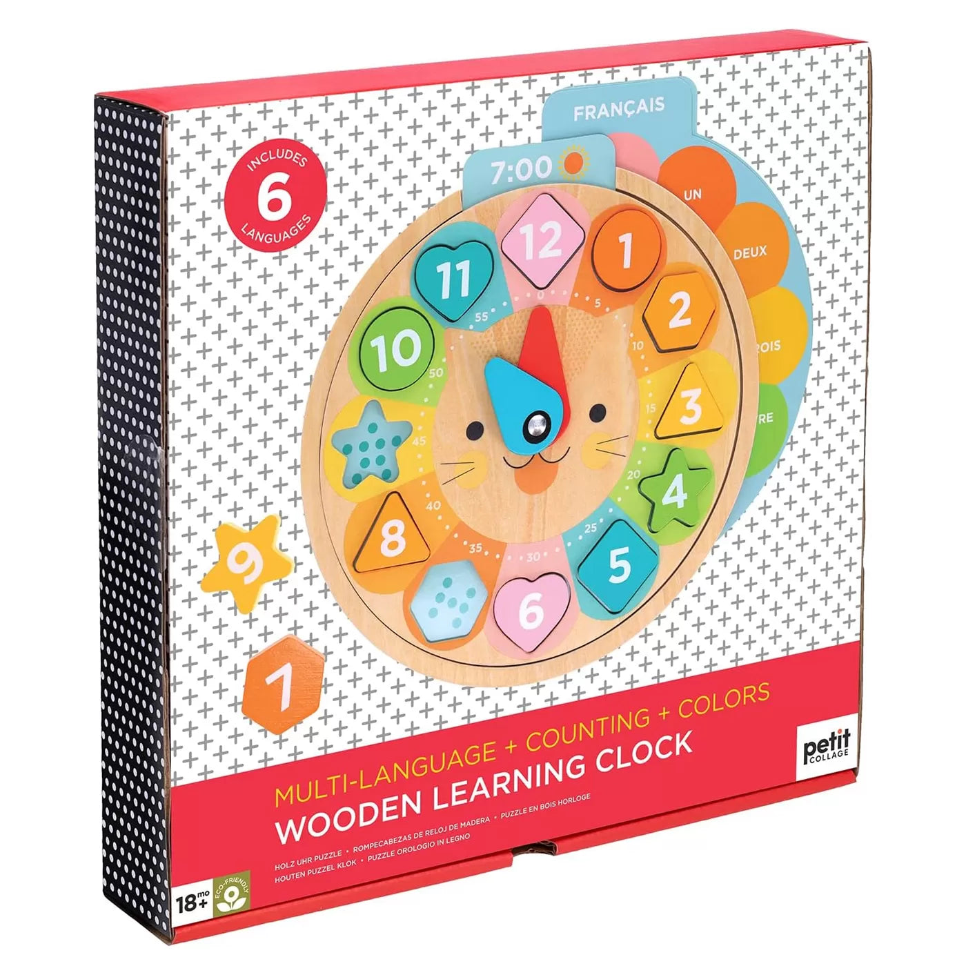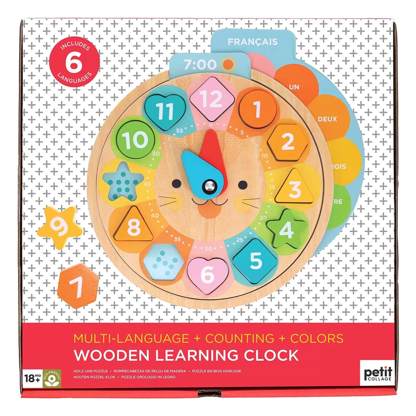 Bu sevimli aslan saat ile çocuklar, altı farklı dilde zamanı söylemeyi, sayı saymayı ve renkleri ve şekilleri öğrenecekler. Kartlardaki saatleri doğru şekilde uygulamak için saatin kollarını döndürecekler. Bu çok amaçlı ahşap oyuncakta dil kartlarını değiştirip farklı dillere geçiş yapmak çok kolay.