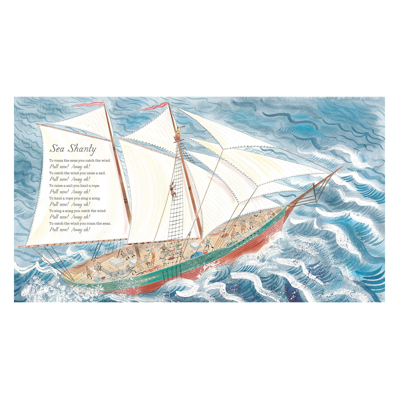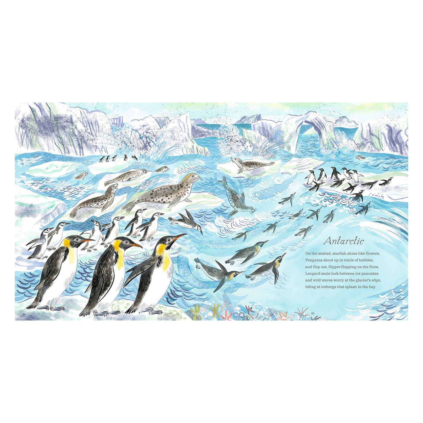 Dünya okyanusları ve kıyıları hakkında büyüleyici bir kitap. Bu kitapla çocuklar, yunuslarla ve uçan balıklarla birlikte yüzebilir, kaya havuzlarını inceleyebilir ve kutuplara doğru yelken açabilir, fosforesans ve planktondan manta ışınlarına ve martılara kadar her şeyi öğrenebilirler. Emily Sutton'ın enfes suluboya çizimleri eşliğinde bir çocuğun denize ilk bakışının nefes kesen heyecanını, eski ticaret gemilerinin görkemini ve kambur balinanın şaşırtıcı yönlerini keşfedebilirler.