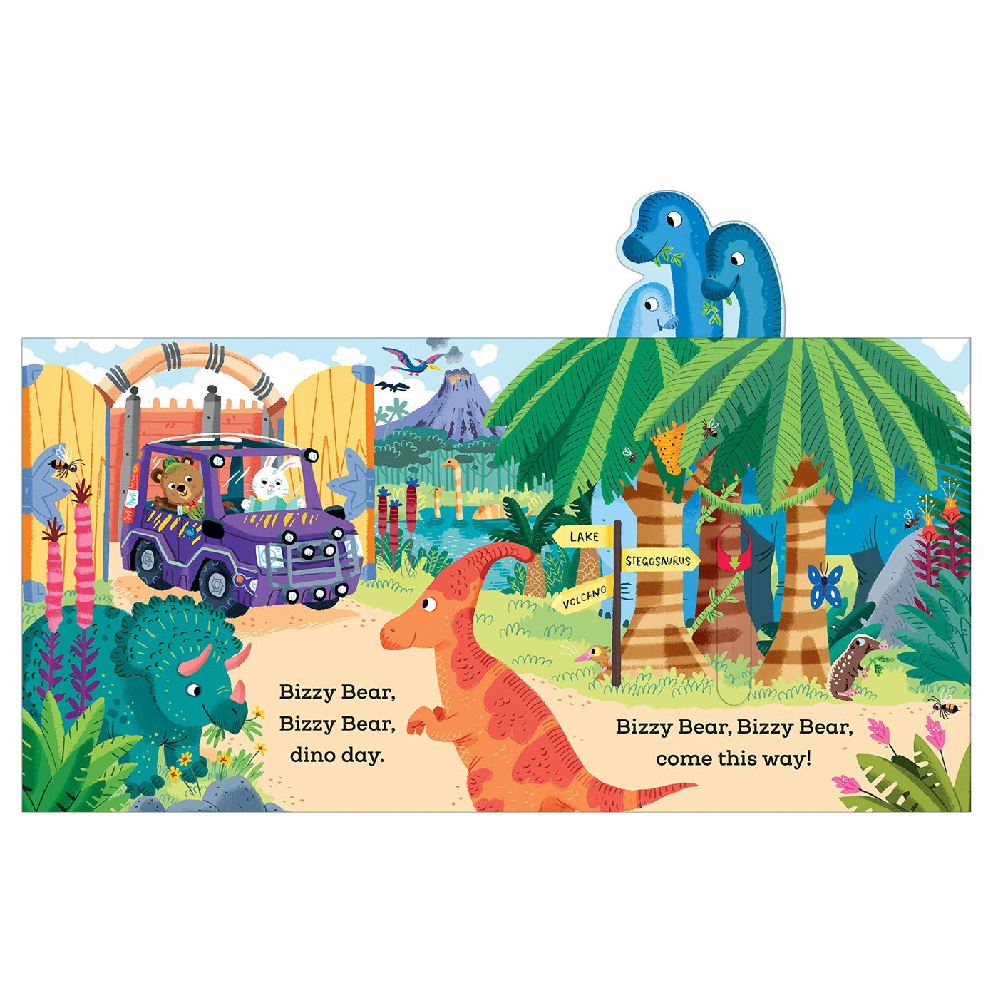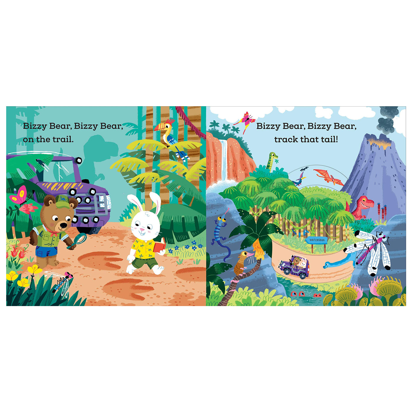 Dinozor Yaban Hayatı Parkı'nı ziyaret eden Bizzy Bear, bazı ilginç ayak izleri keşfeder. Bu izler nereye gidiyor ve hangi dinozora aitler? Bizzy Bear ile keşfetmeye ne dersin? Küçük eller, mekanizmaları iterek, çekerek ve çevirerek hikayeyi bir sonraki sahneye taşıyor ve kafiyeli metinlere hayat veriyor.