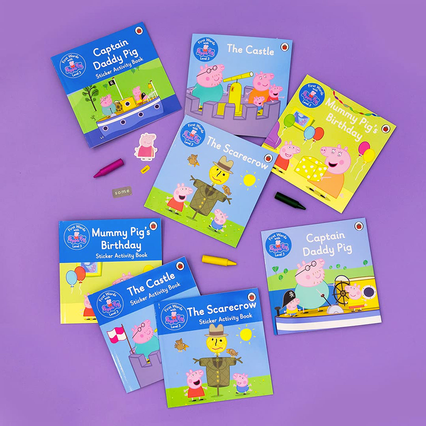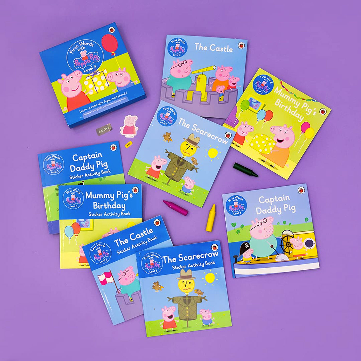 Bu harika setin içinde İngilizce öğrenen çocuklar için seviyelendirilmiş 4 adet Peppa Pig hikaye kitabı ve 4 adet sticker aktivite kitabı yer alıyor. Çocuklar, bu kitaplar sayesinde en sık kullanılan İngilizce kelimeleri pratik yapma imkanı buluyor. Set, Captain Daddy Pig, Mummy's Pig's Birthday, The Castle, The Scarecrow kitaplarını içeriyor. Bunlara ek olarak aynı isimli sticker içeren aktivite kitapları da bulunuyor.