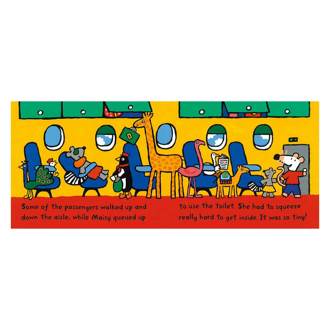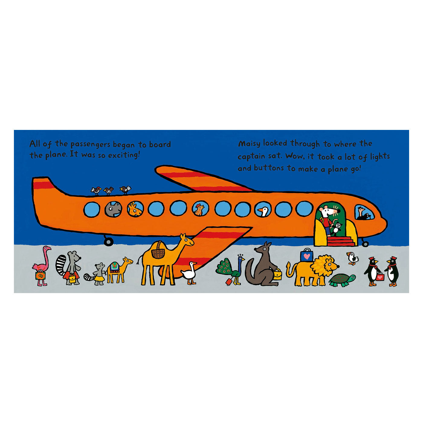 Çok ödüllü Lucy Cousins'in Maisy İlk deneyimler serisinden ilk kez uçmanın hikayesi. Maisy, arkadaşı Ella'yı görmek için bir yolculuğa çıkıyor, ama Ella o kadar uzakta yaşıyor ki, Maisy'nin uçakla gitmesi gerekiyor ve bu çok heyecan veren bir yolculuk! Bir uçağı hareket ettirmek için ne kadar çok ışık ve düğme gerekiyor! Maisy çok geçmeden Bay Percy ve Betsy ile arkadaş olur; ve içecekler, dergiler ve zorlu bir tuvalet molasından sonra, yolculuk hiç zaman kaybetmeden bitiyor! Tatile gitmeden önce çocukları hazırlamak için mükemmel bir kitap.