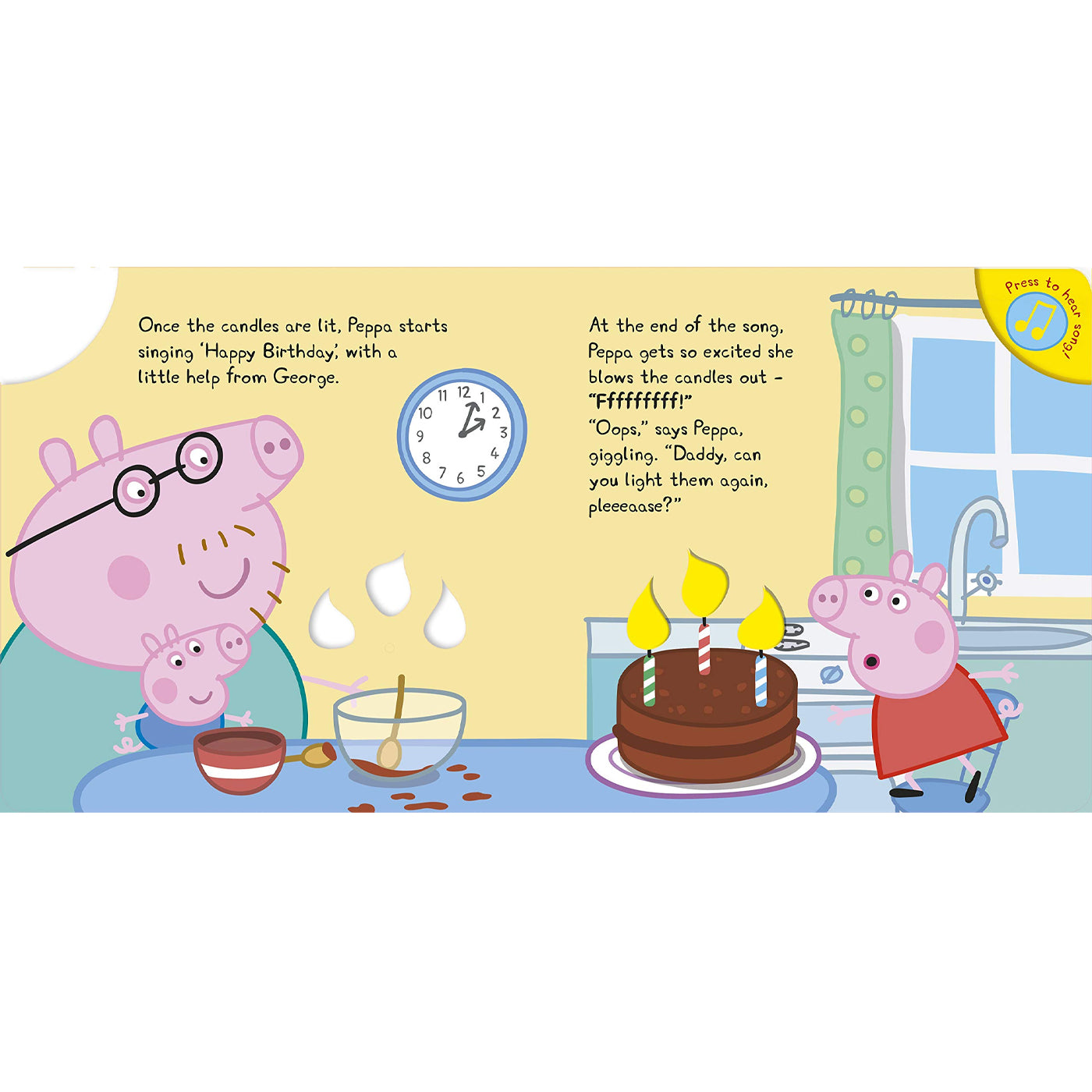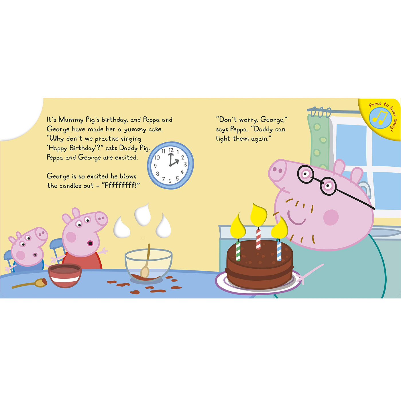 Bugün Anne Domuz'un doğum günü! Peppa, George ve Baba Domuz'a katılarak, Anne Domuz'un doğum gününü kutlamaya ne dersiniz? Bu eğlenceli kitabın arka kapağına sabitlenmiş düğmesine bastığınızda, kapaktaki pastanın mumları yanıyor ve iyi ki doğdun müziği çalmaya başlıyor... Hepsi bu kadar da değil; üflediğiniz zaman pastanın mumları da sönüyor ve müzik de duruyor... Hikaye boyunca, aile üyeleri ise işte bu sürekli sönen mumlarla uğraşıyor.
