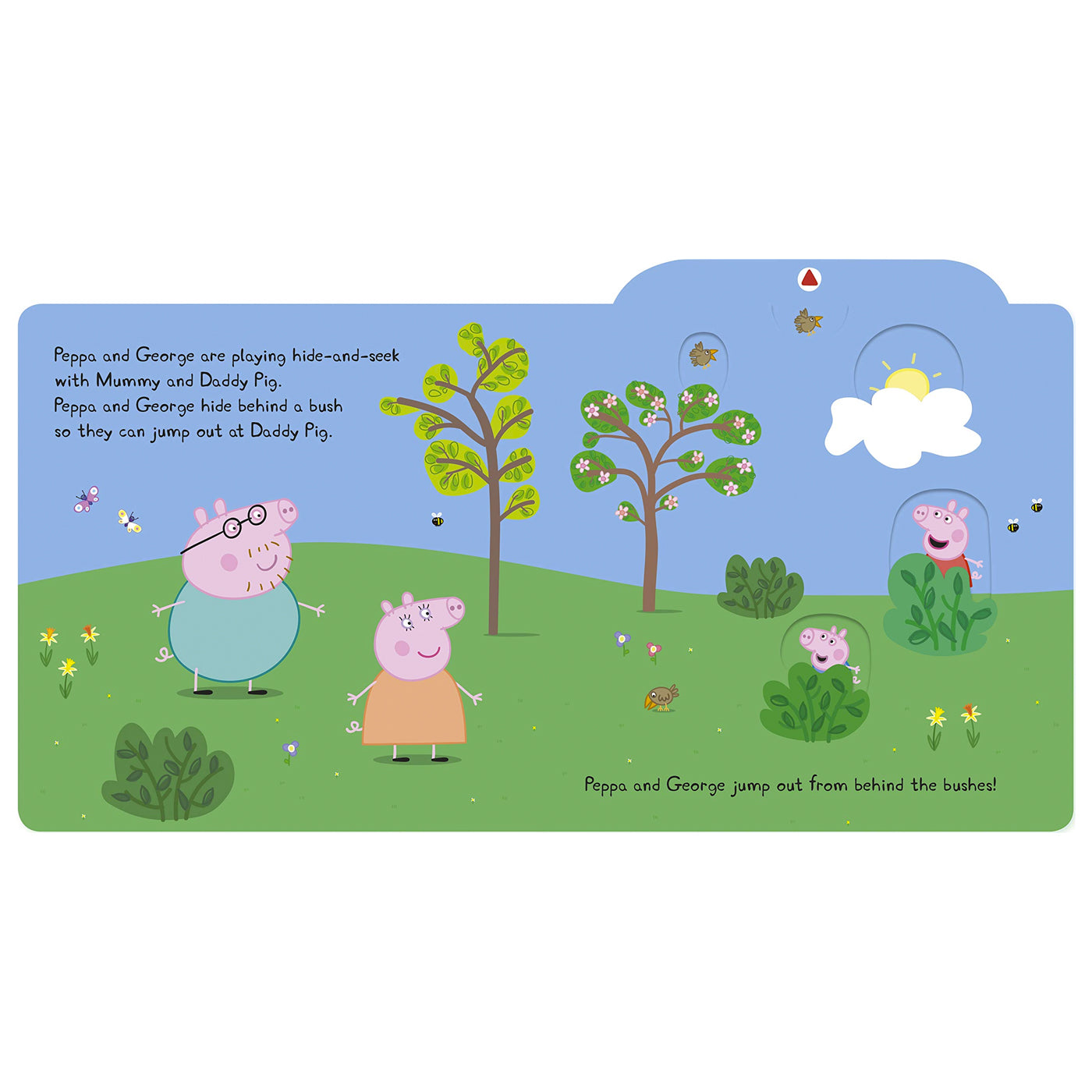 Peppa ve George, anne ve baba domuzla birlikte parka gidiyorlar. George kelebeklere hayranlıkla bakıyor, Peppa ve George çalılıkların arkasına saklanıyor. Ama o da ne Peppa ve George'un uçurtması ağaca takılıyor. Acaba onu ağaçtan nasıl alacaklar? Sürgülü kısımları itip-çekerek sen de onların park macerasına ortak olabilirsin.