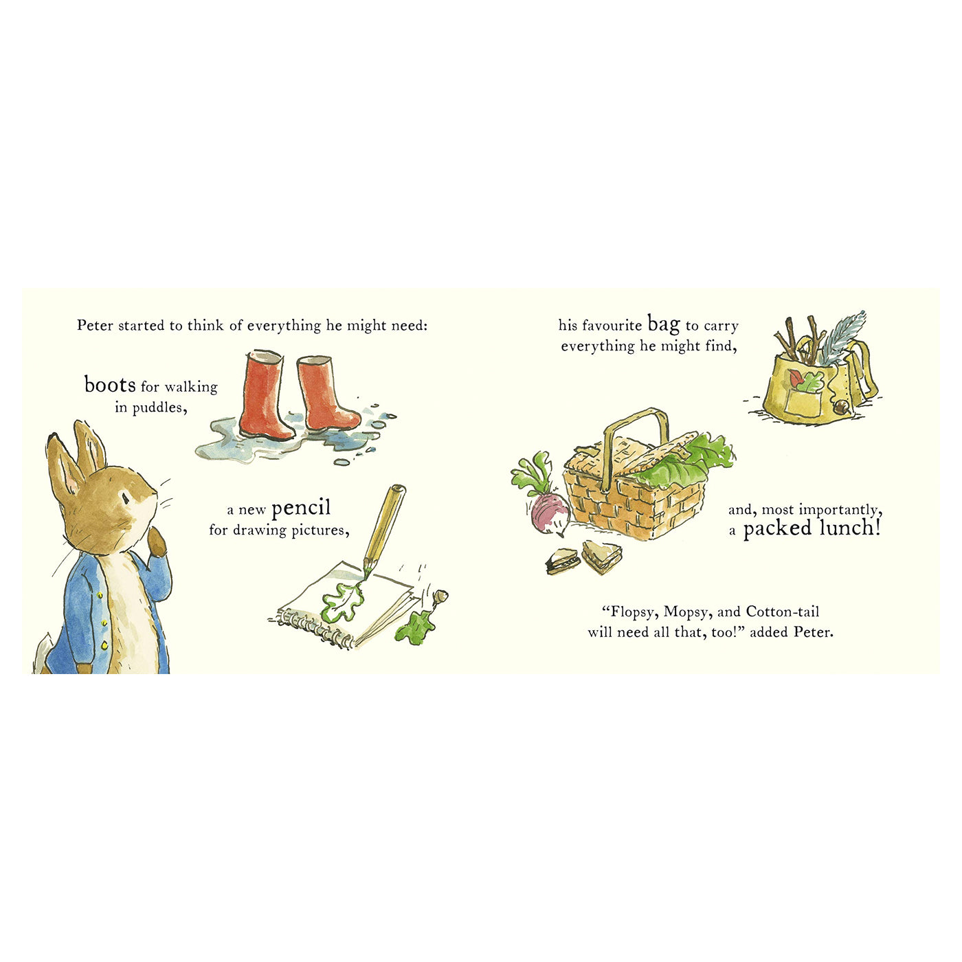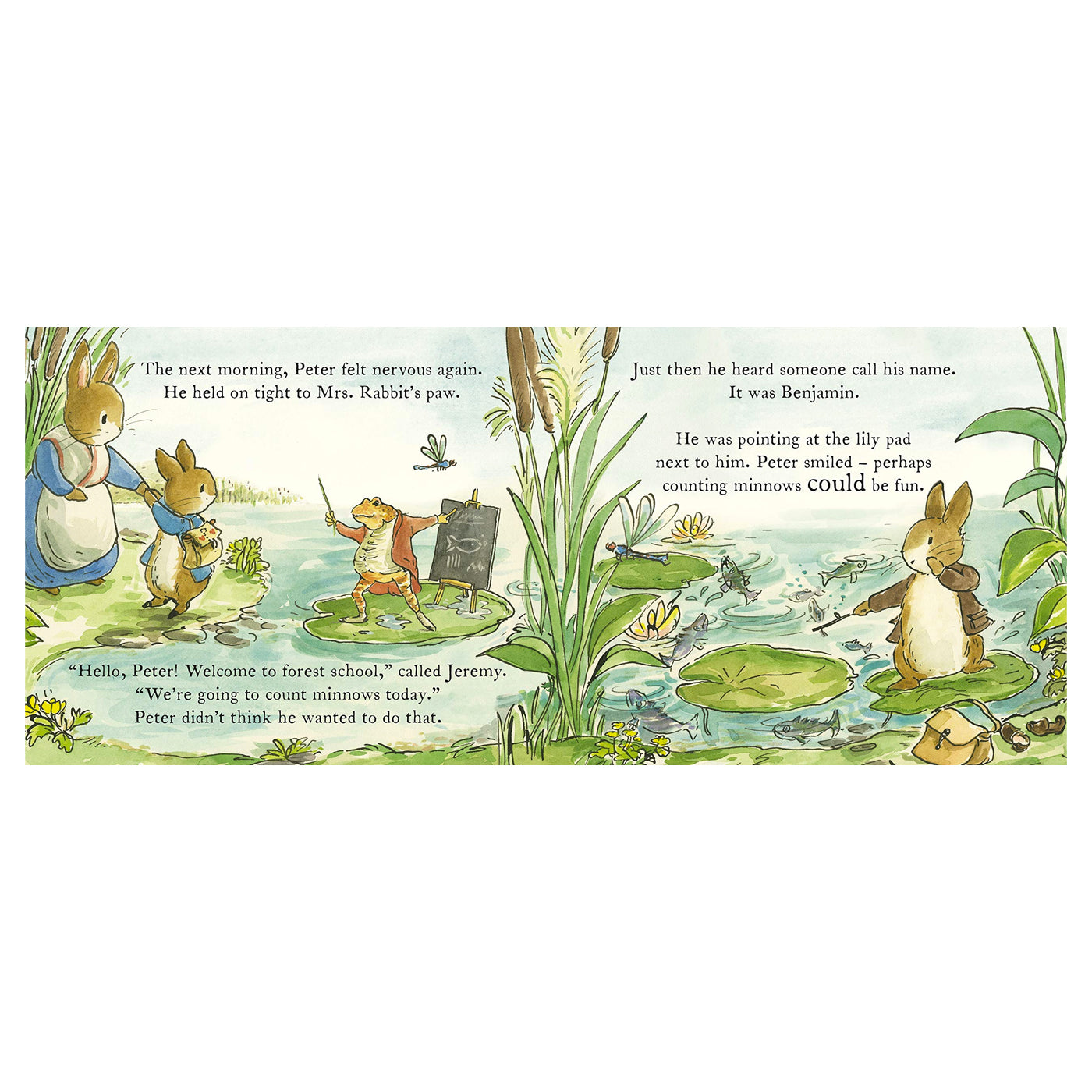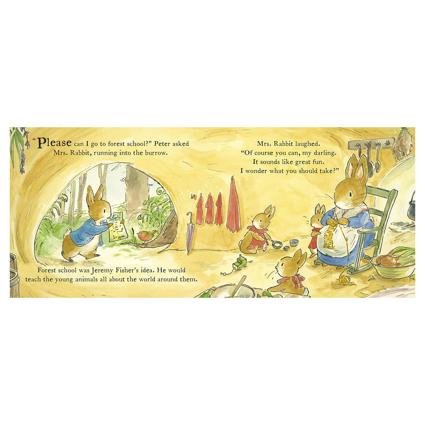 Okula yeni başlayacaklara ilham ve cesaret veren sıcacık bir hikaye. Peter Rabbit okula başlayacağı için çok heyecanlı. Yağmur çizmesine, beslenme çantasına, yeni bir kaleme ihtiyacı olduğunu düşünüyor. Neyse ki kız kardeşleri onun için bir sürpriz hazırlıyor. Ama Peter buna rağmen okulun ilk günü annesinin elini pek de bırakmak istemiyor. Fakat Benjamin Bunny'nin de orda olduğunu öğrenince, okulda olma fikrine daha sıcak bakıyor.