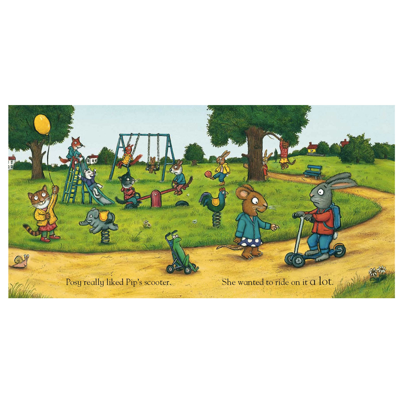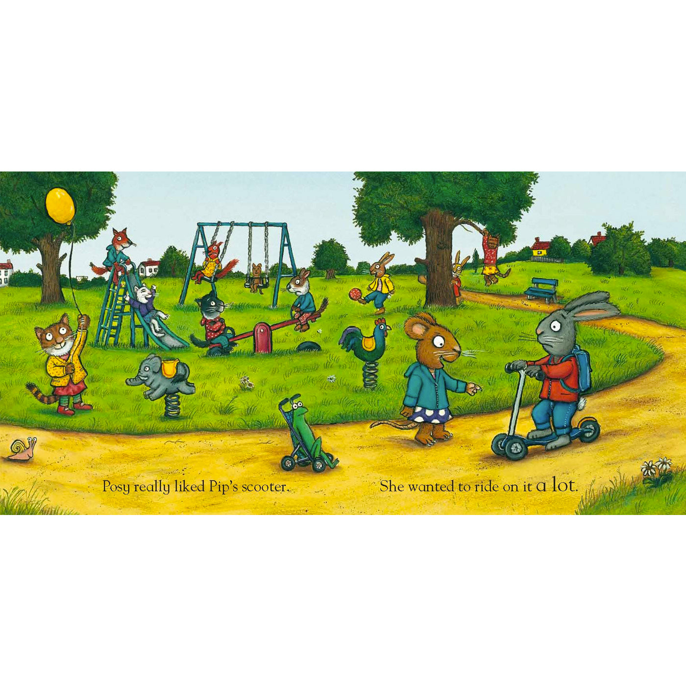 Pip ve Posy birbirlerinin en iyi arkadaşları. Beraber eğlenmeyi ve oynamayı çok seviyorlar. Ancak ara sıra üzülüp, sinirlenebiliyorlar. Fakat her ne yaşarlarsa yaşasınlar, sonunda nezaket ve anlayışla birbirlerini kucaklıyorlar. Bu hikayede ise Posy, Pip'in scooter'ını ödünç alıyor ve onu sürmeye çalışıyor. Sonra düşerek kendini kötü bir şekilde yaralıyor. Pip ona kızgın olmasına rağmen yardım etmek için koşuyor ve Posy'nin ağrıyan dizine pansuman yapıyor. Posy de Pip'ten özür diliyor... Ünlü illustratör Axel Scheffler'ın bu çok beğenilen serisi, çocukların yaşadıkları iniş ve çıkışları, hayal kırıklıklarını ve arkadaşlık bağlarını son derece naif bir anlatım ve yine muhteşem çizimlerle anlatıyor.