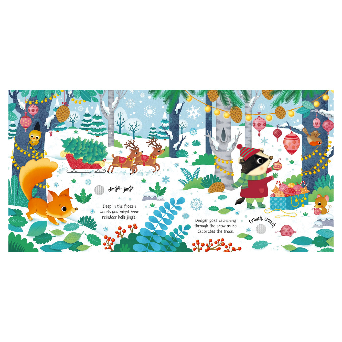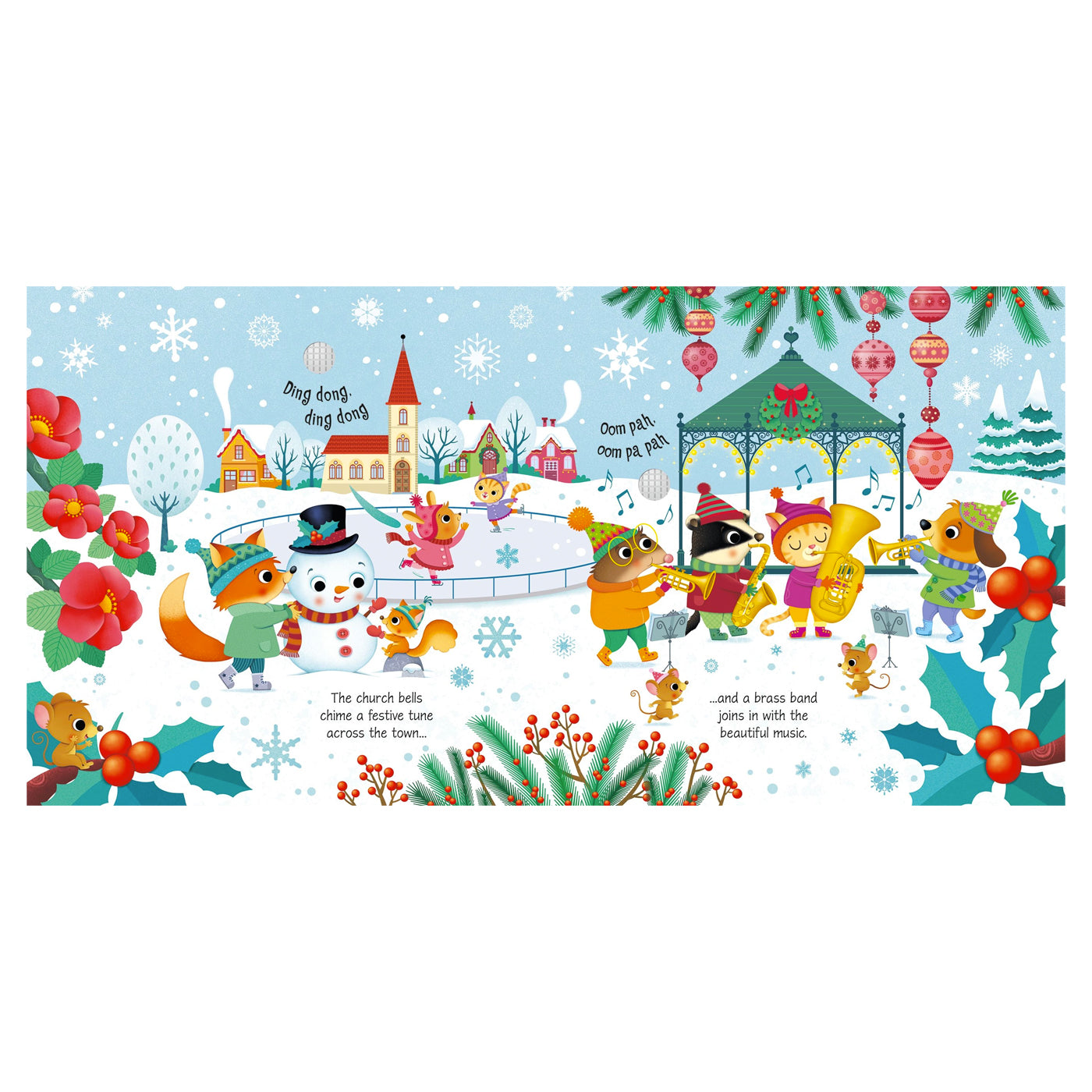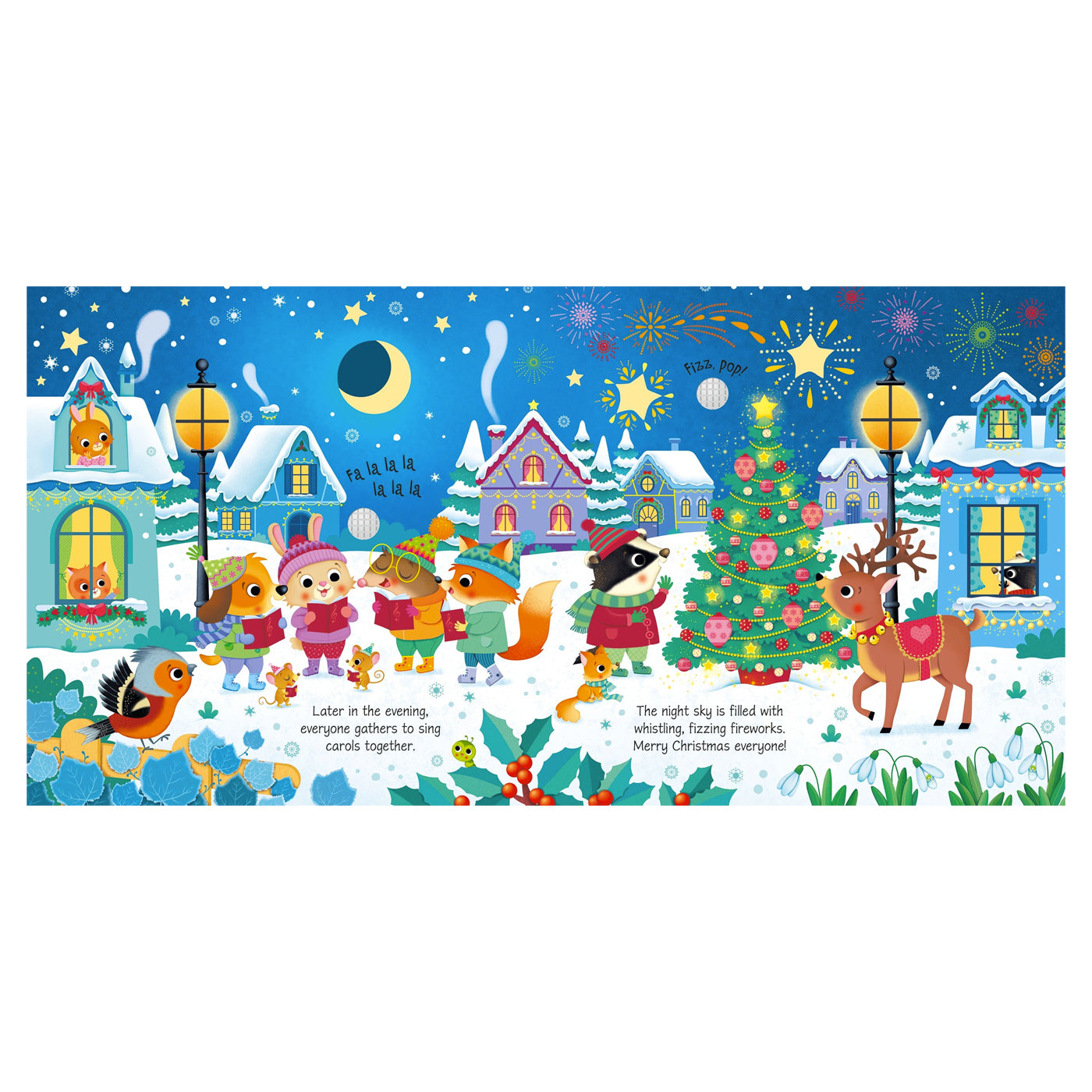 Büyülü bir kış mecarasına hazır olun. Noel şarkılarını, ardıç kuşlarının sesini, çıtır çıtır sesler çıkaran bir ateşi ve çok daha fazlasını dinlemek için sayfalardaki düğmelere basmanız yeterli. Bu sesli kitapta ayrıca, buz pateni yapanlar, Noel süslerini asan hayvanlar gibi güzel sahneler de küçükleri bekliyor.