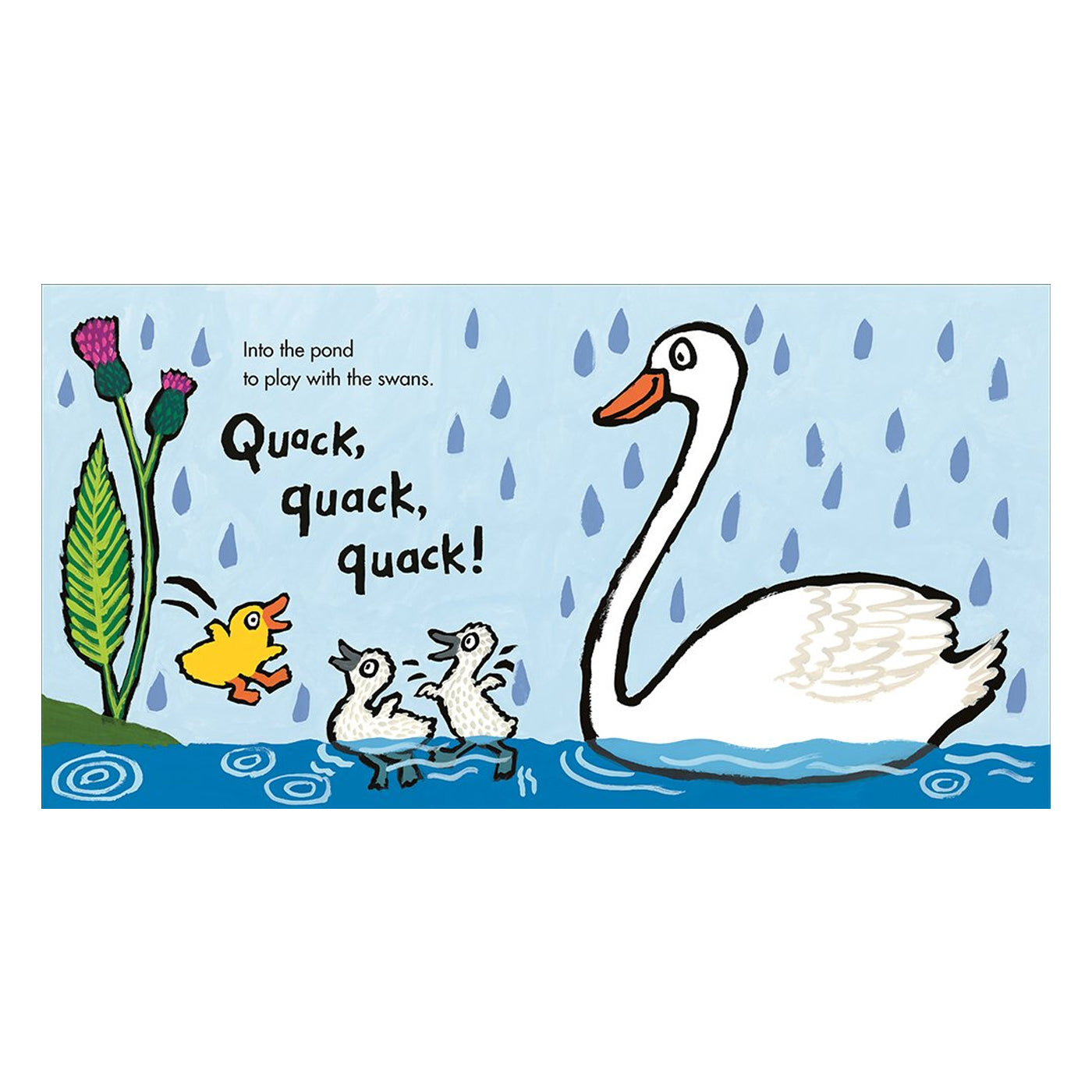 Maisy serisinin yaratıcısı, ödüllü yazar Lucy Cousins, küçükleri bir ördek yavrusunun ve onun arkadaşlarının maceralarına ortak ediyor. Sevimli ördek Ducky, yağmurlu günlerde çok eğleniyor. Kendini mutlu hissettiğinde "vak, vak, vak" diyor. Ducky'nin eğlenceli gününe kurbağa, solucan, böcek ve kuğu gibi farklı canlılar da ortak oluyor.