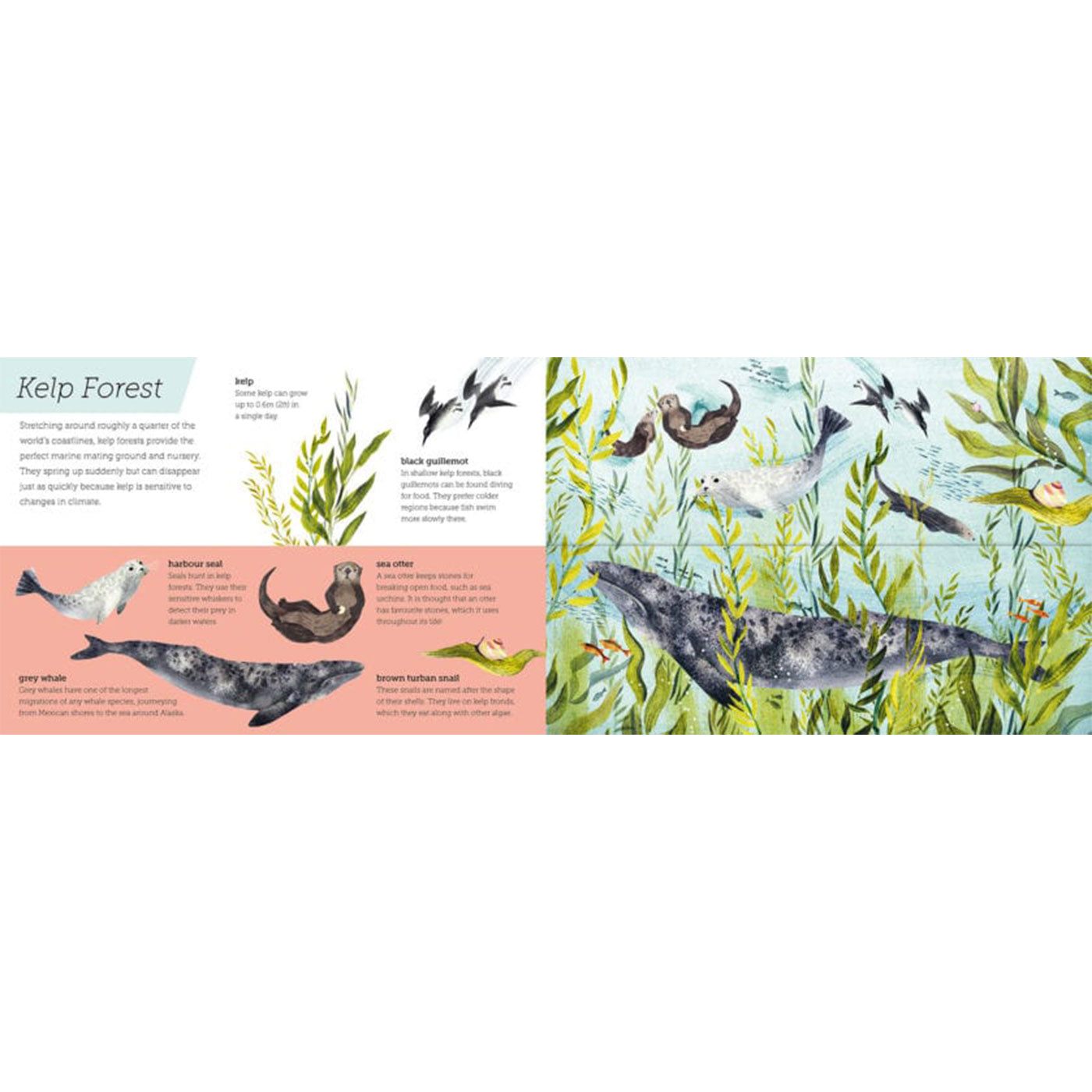Okyanusun mavi sularının altında uzanan inanılmaz yaratıkları ve bitkileri keşfetmek için sayfayı çevirin! Güzel çizimlere ve büyüleyici gerçeklere sahip olan bu kitaba küçük doğa tutkunları bayılacak! Muhteşem mangrov ormanları ve renkli mercan resiflerinden heyecan verici haliçlere ve tehlikeli derin denizlere kadar keşfedilecek çok şey var. Küçük öğrenciler, bölünmüş sayfaların ardındaki bilgilerle vahşi yaşam hakkında daha fazla şey öğreniyor.