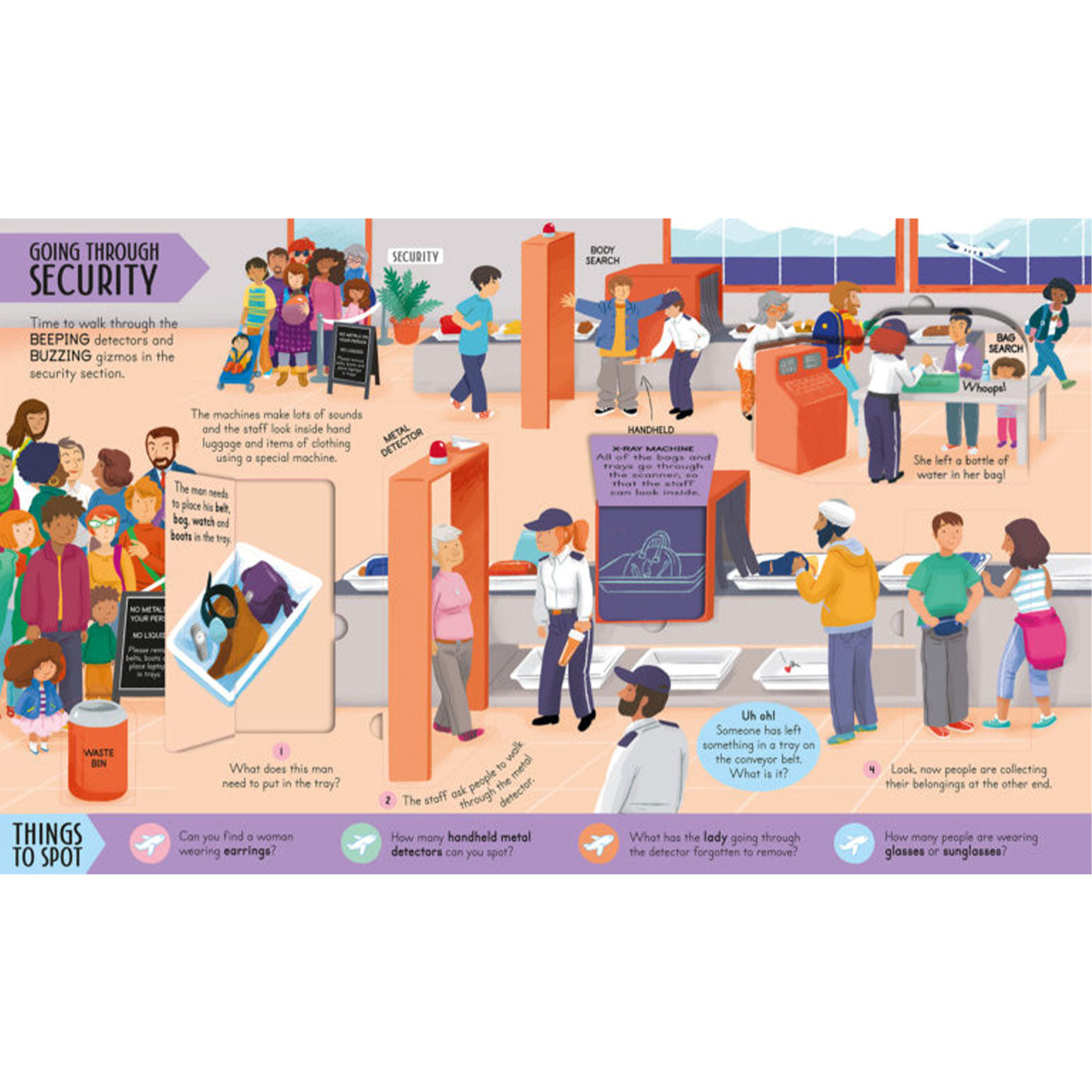 Kaldırılacak düzinelerce kapakçık ve ortaya çıkarılacak birçok bilgi ile bu hareketli havalimanı temalı kitapta görülecek çok şey var. Check-in heyecanı ve kargaşasından onlarca uçağın kalkış için beklediği piste kadar havalimanı hakkında her şeyi öğrenebilirsiniz. Sayfaların altında yer alan sorulara bakın ve cevapları resmedilen sahnelerde bulmaya çalışın!
