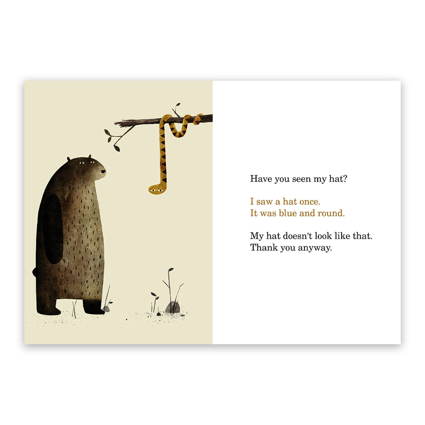 York Times En Çok Satanlar listesinde yer alan bu kitapta, ayının şapkası gidiyor ve o şapkasını geri istiyor. Sabırla ve kibarca karşılaştığı hayvanlara tek tek şapkasını görüp görmediklerini soruyor. Hepsi hayır diyor. Ama tam ayı umutsuzluğa kapılırken bir geyik geliyor ve ayının hafızasını ateşleyen basit bir soru soruyor...
