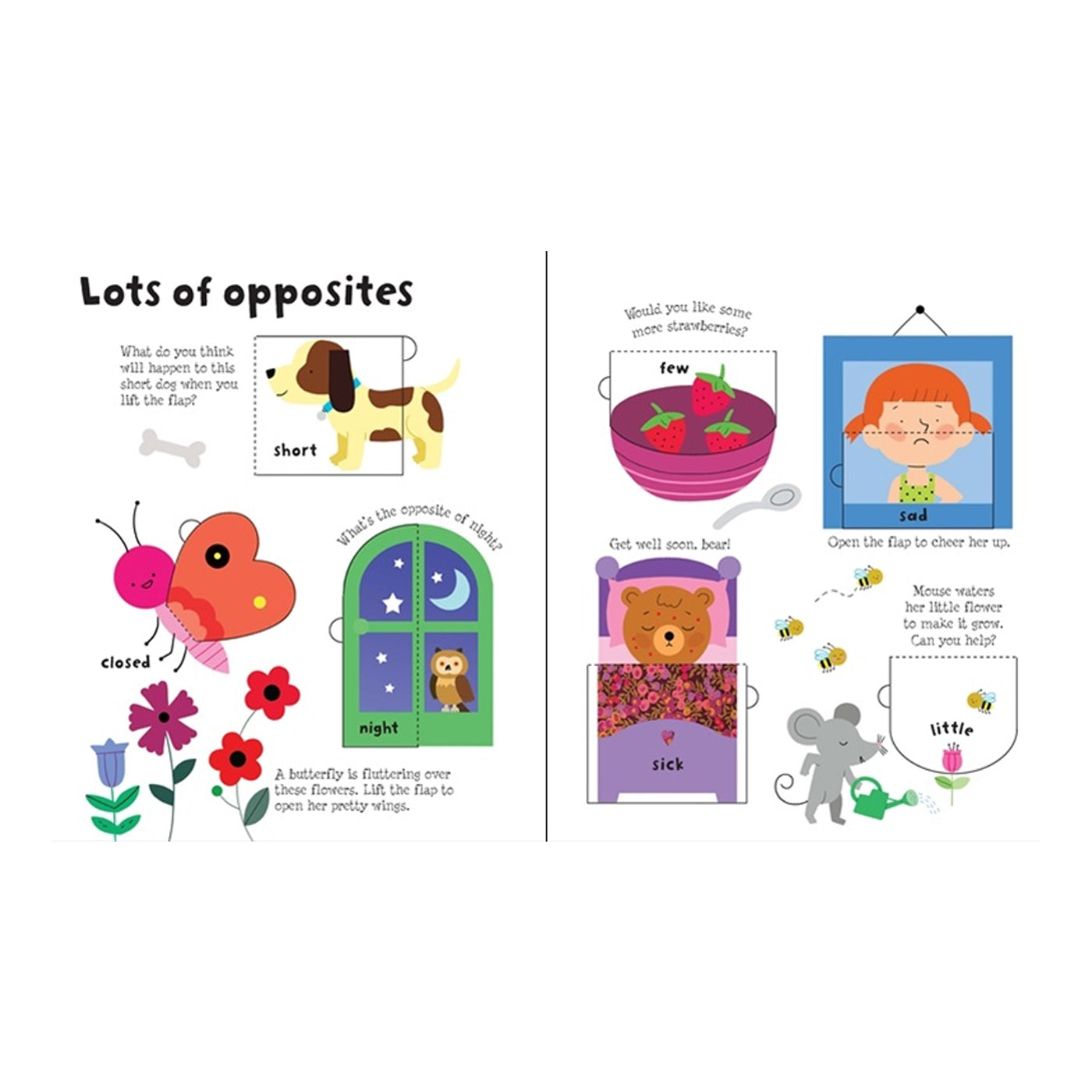 Zıt kavramları okul öncesi çocuklara eğlenceli bir şekilde anlatan kitap, çocukların kelime dağarcığını zenginleştirmeye de yardımcı oluyor. Park, okyanus, orman gibi farklı yaşam alanlarının resmedildiği sayfalarda yer alan hayvan figürlerinin üstündeki kanatlar açıldığında, betimlenen kavramın tam tersi görülebiliyor. Bu sayede çocuklar büyük-küçük, yüksek-alçak, yukarı-aşağı gibi zıt kavramları görsel destekle daha kolay bir şekilde öğrenebiliyor.