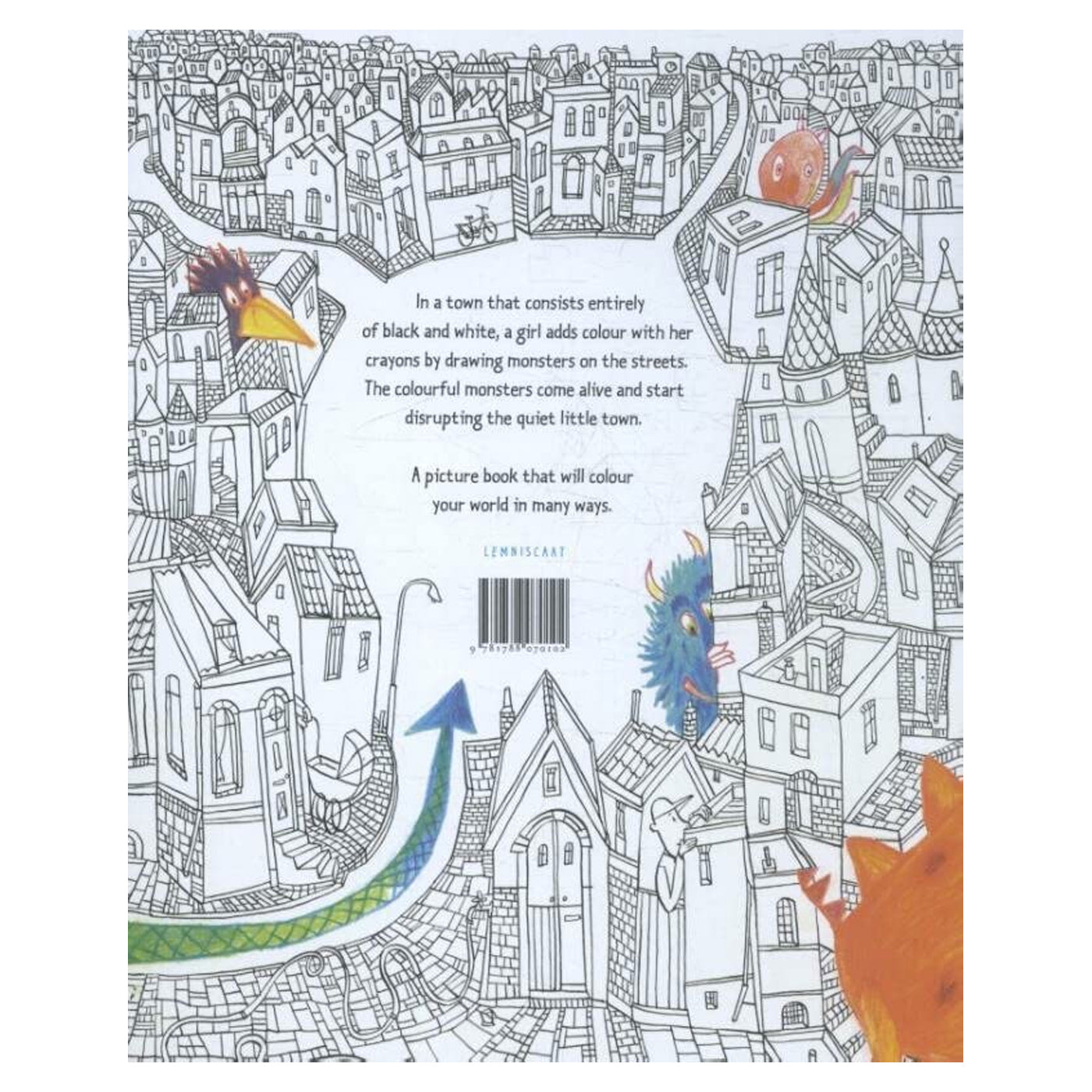 Bu kitap, kelimelerin olmadığı ama hikayelerle dolu bir dünya yaratıyor. Tamamen siyah ve beyaz renklerden oluşan bir kasabada bir kız, boya kalemleriyle sokaklara canavarlar çizerek renk katıyor.