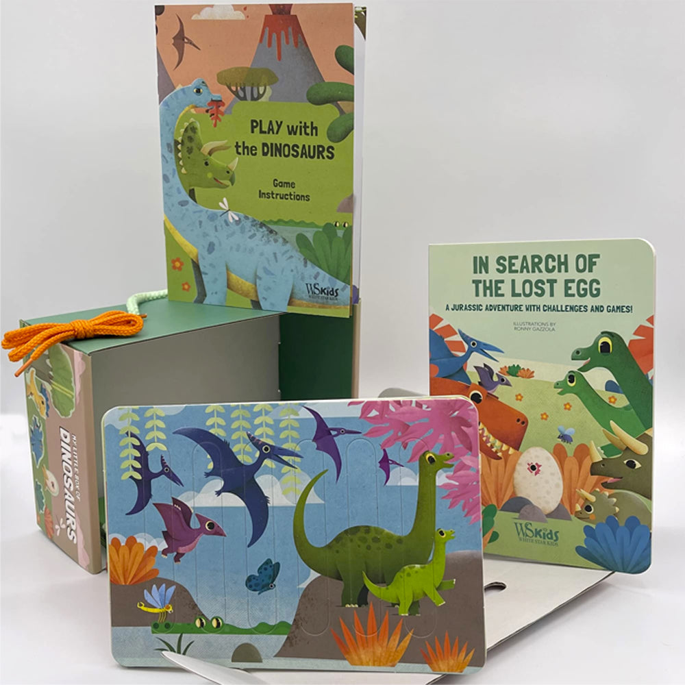 Çocuklar gittikleri her yere yanlarında taşıyabilecekleri bu setteki dinozorlarla eğlenceli dakikalar geçirebilirler. Bu harika kutunun içinde dinozor hikayesi, oyun tahtası ve kendi 3D tarih öncesi dünyanızı yaratmanız için 70 çıkarılabilir parça içeren bir kitap bulunuyor. Etkinlikler arasında birkaç yapboz, bir hafıza kartı oyunu ve bir domino seti de yer alıyor.