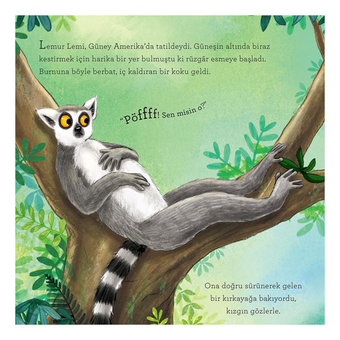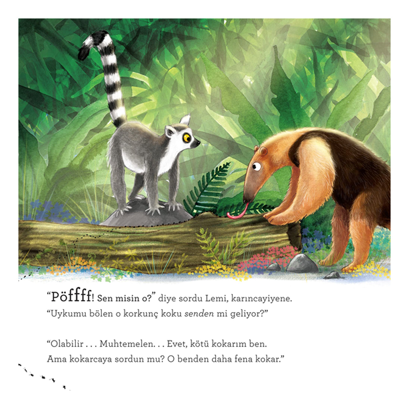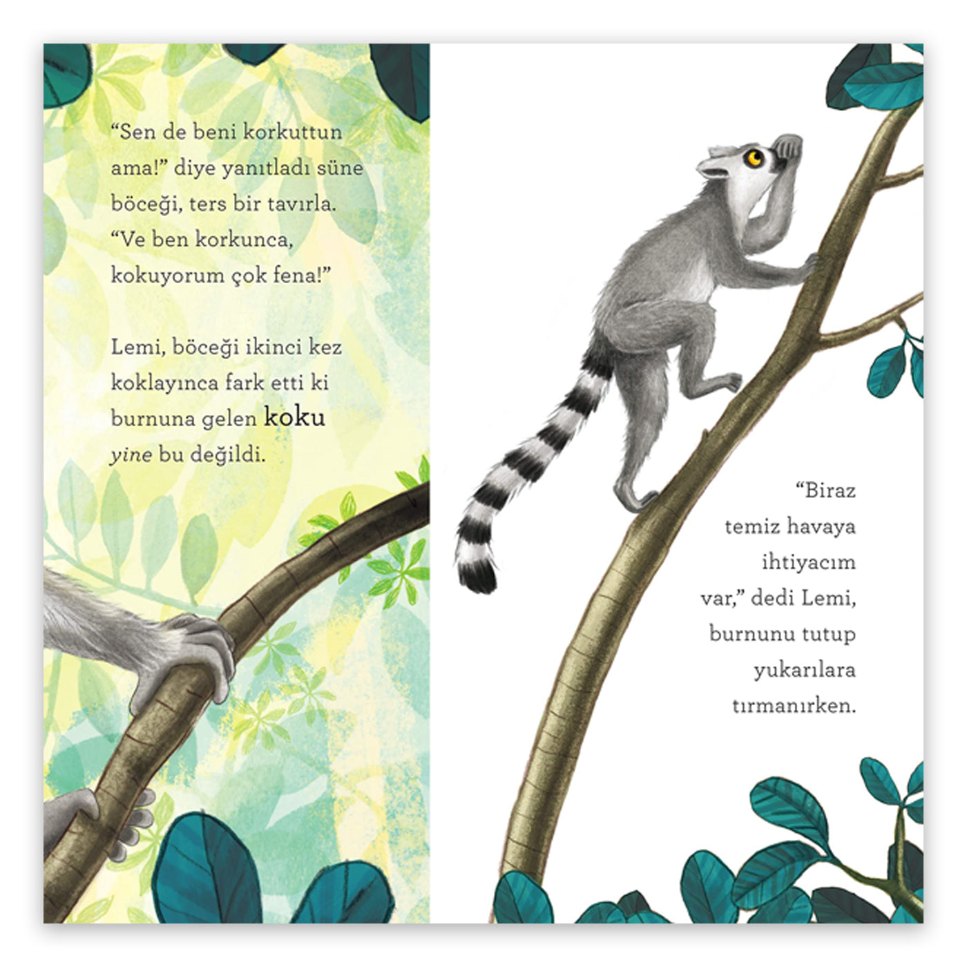 Lemur Lemi Güney Afrika'da harika bir ormanda tatilde... Tam ağaç dallarının arasında uzanmış keyfine bakarken burnuna kötü bir koku geliyor. Bu kokunun hangi hayvandan geldiğini anlamak için ormanda küçük bir yolculuğa çıkıyor. Kırkayaktan hoatzin'e, küçük karıncayiyenden kokarcaya gerçekten kötü koku salan pek çok hayvanla karşılaşıyor. Ama o merak ettiği kokunun kaynağını öğrendiğinde ise çok ama çok şaşırıyor! Waterstones Çocuk Kitapları Ödülü sahibi çizer Nicola O’Bryne ile ödüllü yazar Clare Helen Welsh’in birlikteliğinden ortaya çıkan bu kitap, çocukları kötü kokulu dostlarımızla eğlenceli bir şekilde tanıştırıyor. Kitabın sonunda ise hikâyede adı geçen hayvanlar hakkında ilginç bilgiler ve fotoğraflar yer alıyor.