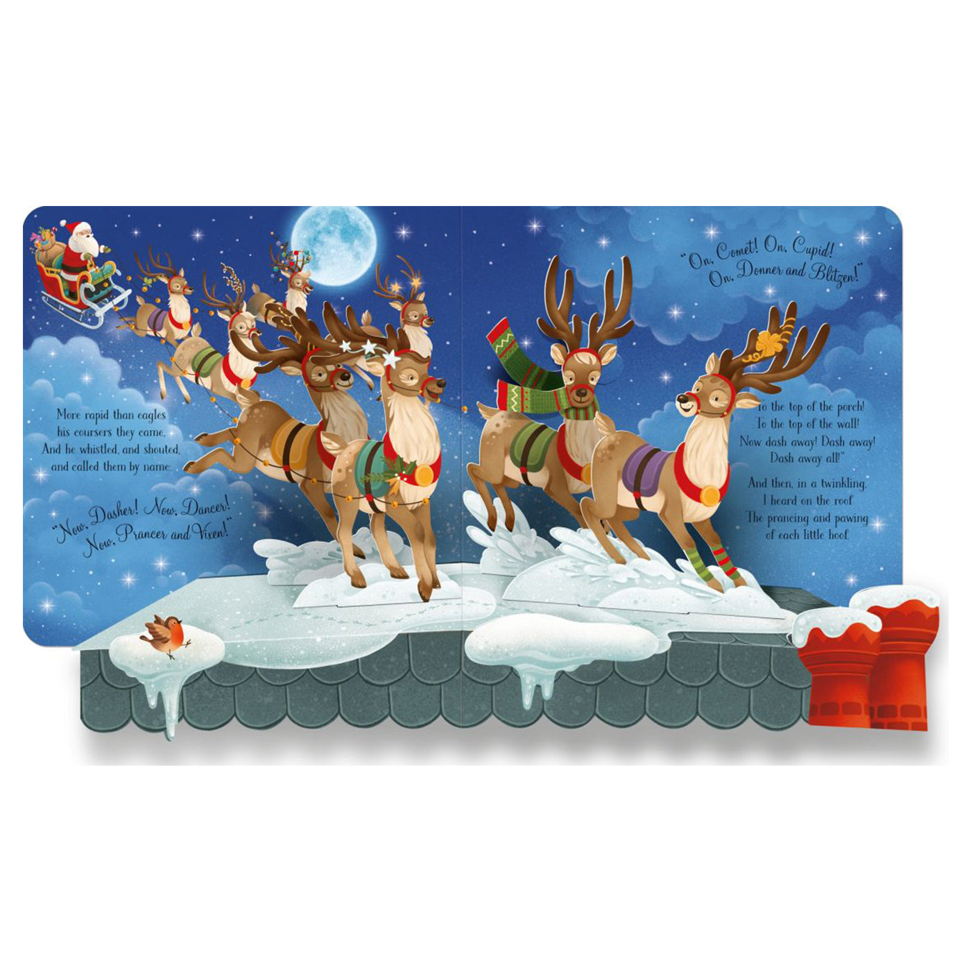 Pop up sayfaları ile Noel’den önceki gece bu eve konuk olun. Noel Baba geyikleri ile yıldızlı gökyüzünde süzülüyor ve herkes derin bir uykudayken çocukların hediyelerini bırakıyor. Bu tatlı Noel hikayesini dinlemek için ücretsiz çevrimiçi ses linki de bulunuyor.
