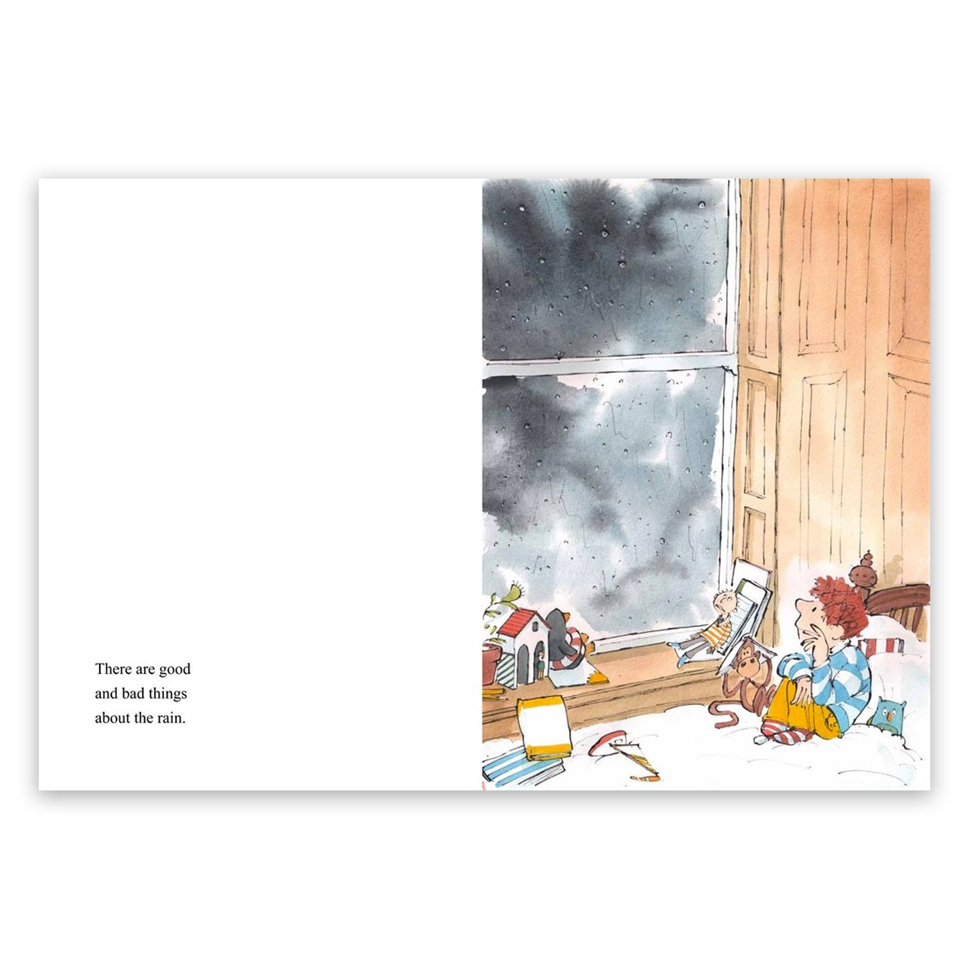 Küçük çocuk sabah uyanıp yağmur yağdığını görünce çok heyecanlanıyor. Bir önce dışarı çıkıp yağmurun tadını çıkarmak istiyor. Fakat büyükbabası, tıpkı diğer yetişkinler gibi yağmurda dışarı çıkmaya çok da hevesli değil. Büyükbaba, en azından yağmur durana kadar onu evde kalmaya ikna ediyor. Sonra yağmurdan ıslanmış şehri keşfetmek için bir maceraya çıkıyorlar.