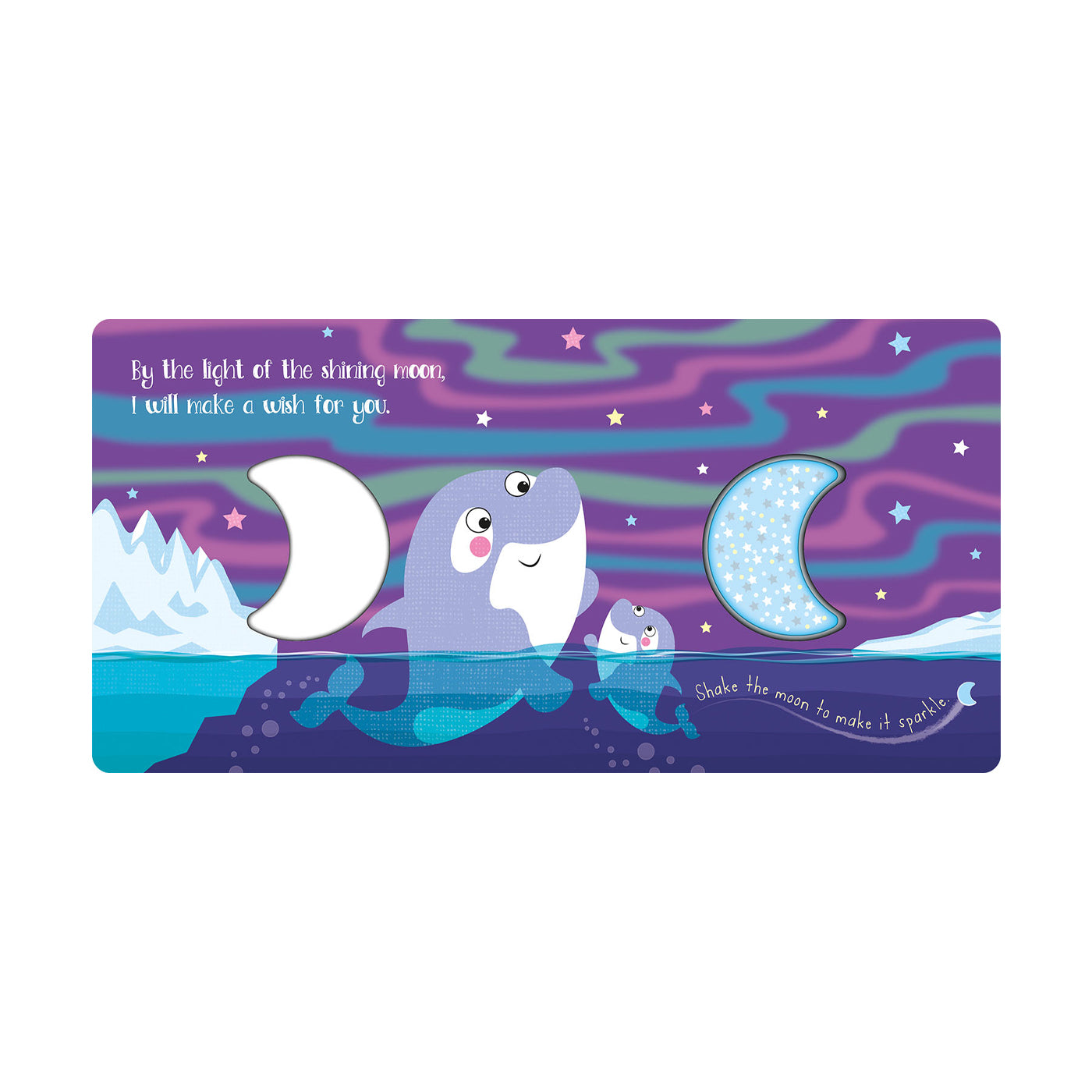 İçinde pırıltlar ve ışıltıların yüzdüğü bir aya sahip bu hikaye kitabı, yatmadan önce okumak için mükemmel bir alternatif! Ayın içindeki renkli parıltı ve folyo şekilleri hareket ettirmek için kitabı sallayın, farklı sayfalara geçtikçe hareket eden pırıltıları gözlemleyebilirsiniz. Sevimli çizimlere, tekrarlayan metinlere, dönen pırıltılı ve parlak aya sahip bu kitaba çocuklar bayılacak!